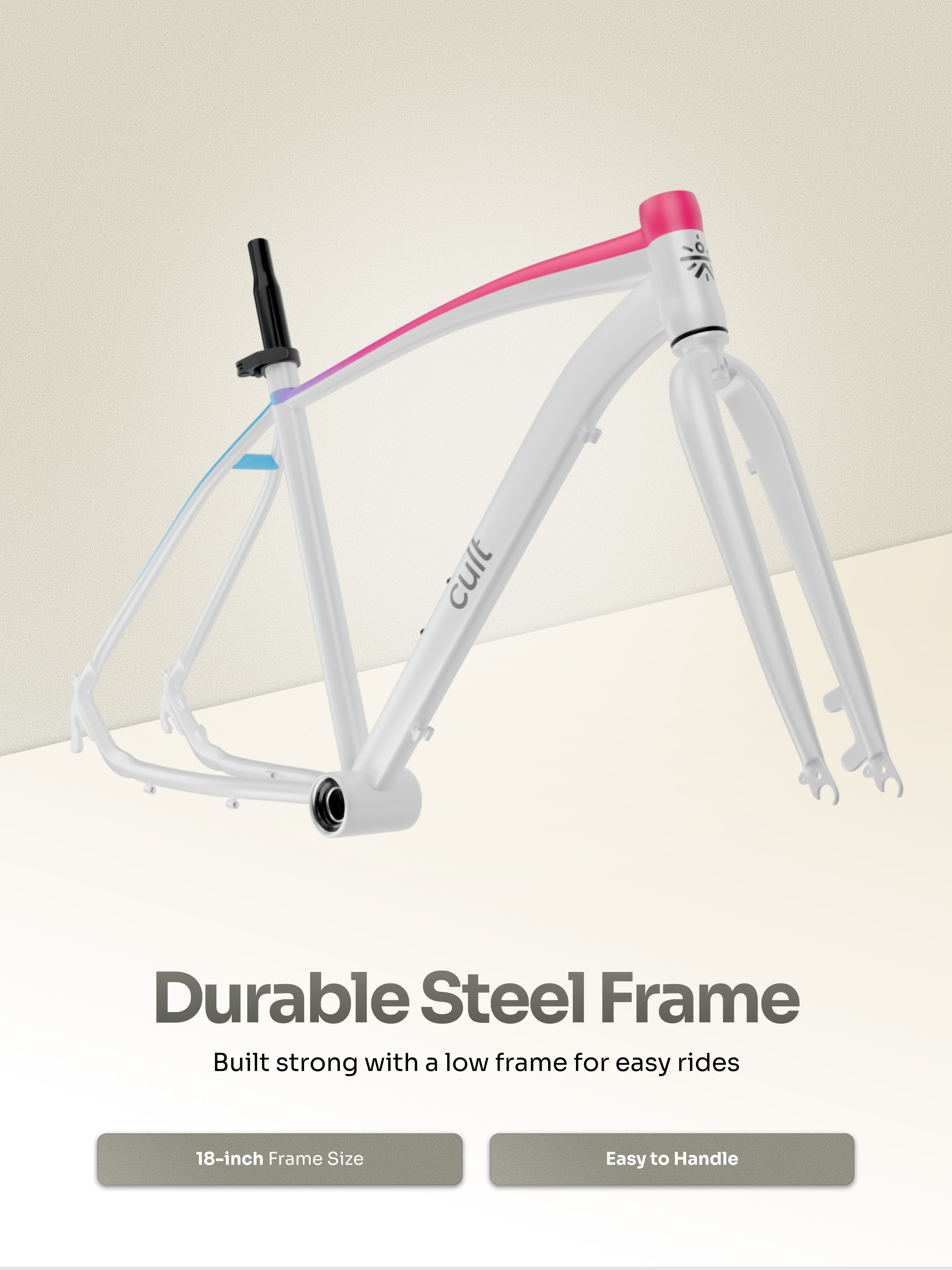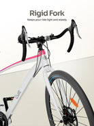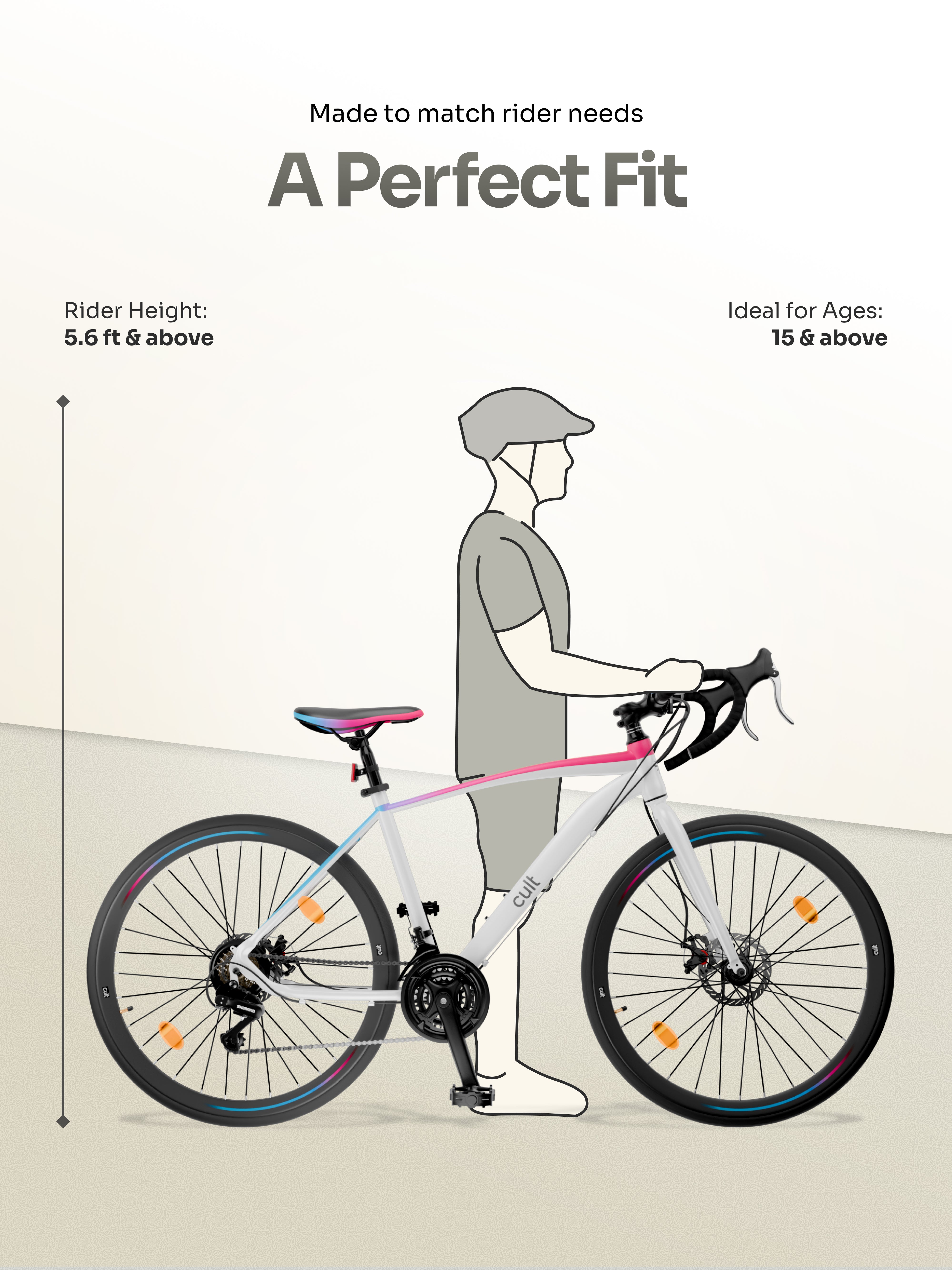 The Cult 700C Road Bike is designed for speed, performance, and everyday commuting. Built with a sturdy 18-inch steel frame and ideal for riders 5.6 ft and above, it offers smooth control with its 21-speed Shimano gears and thumb shifters. The double disc brakes, triple-wall alloy rims, and rigid fork ensure stability and powerful braking on every ride. With quick-release options for the front tire and seat, plus added accessories like a cadence sensor and reflectors, this bike is perfect for fitness rides, long routes, and daily city travel.