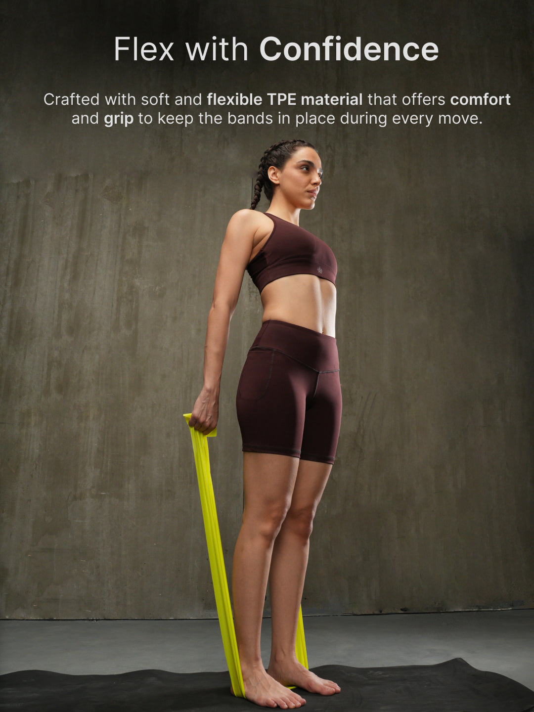 - Pack of 3 bands, Blue, Yellow & Green, Ideal for stretching, yoga & Pilates, Lightweight & portable, Durable latex material, Suitable for men & women