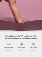 SKIN-FRIENDLY MATERIAL: Made from non-toxic, recyclable TPE and completely latex-free, it’s gentle on sensitive skin and a responsible choice for sustainable wellness. ANTI-SLIP GRIP FOR SUPPORT: The anti-skid base ensures the mat stays firmly in place on smooth floors, offering a safe and steady surface to practice even your most challenging poses. SUPERIOR CUSHIONING FOR JOINT SUPPORT: Crafted with 10 mm extra-thick TPE material, this mat offers plush comfort and reduces pressure on knees, elbows, and other joints—perfect for longer sessions and sensitive users. WITHSTANDS DAILY USE: Built to endure daily practice, the tear-resistant construction resists peeling, cracking, and wear—delivering long-term performance without compromise. LIGHTWEIGHT & TRAVEL-FRIENDLY: Designed for convenience, this mat is easy to carry with its included strap and fits neatly into a yoga bag—ideal for home or outdoor use.