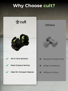 Upgrade your home workouts with Cult 16kg Adjustable, space-saving dumbbell that adjusts from 1.5kg to 16kg in seconds using a smart dial system. Built with durable iron and secure locking, it's ideal for all fitness levels. Includes storage trays for neat organization and comes with a 12-month warranty.