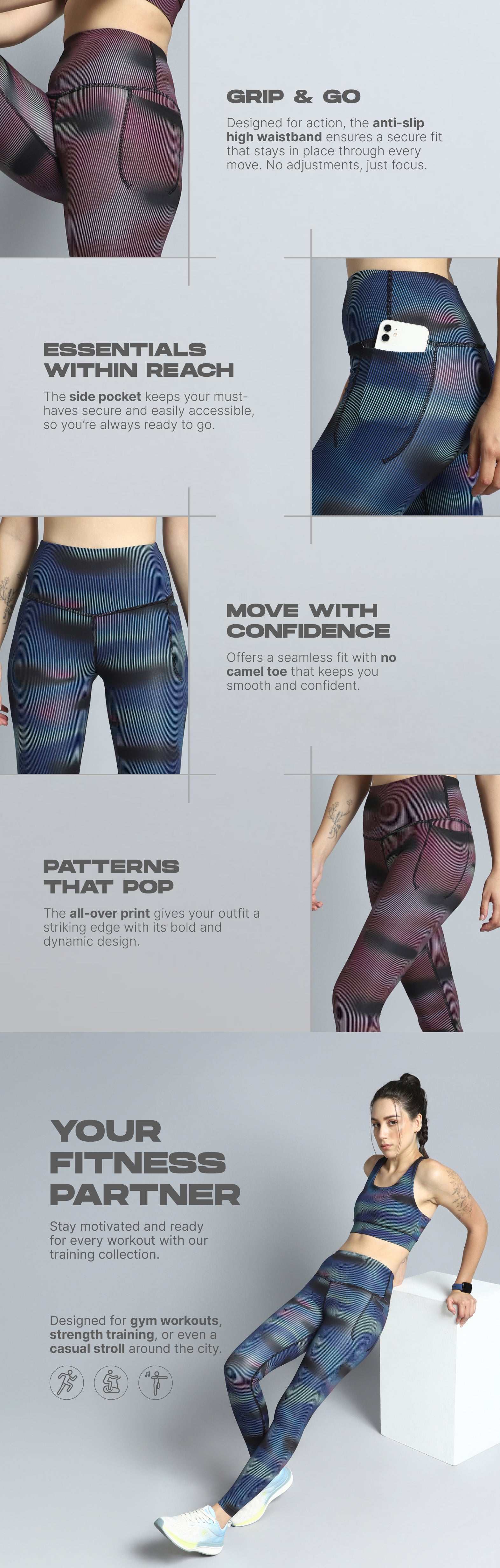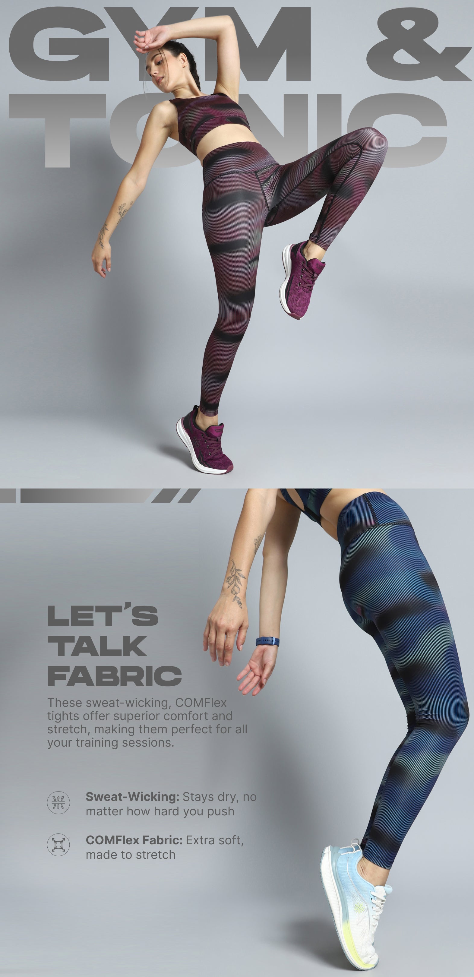 Power through every rep in the Women's Pink Energy Map All Over Print COMFlex Tights. The COMFlex fabric offers unmatched stretch and softness to keep you moving with ease. The anti-slip high waistband with the inner drawcord provides a snug, adjustable fit, while the side pocket keeps your essentials close. The tights are finished with a holographic logo for a bold, sporty edge to your overall look.