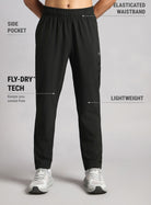 Pick up the pace in the Men's Black Pace up Running Trackpants—built to go the distance in comfort and style. Crafted from lightweight fabric with FLY-DRY™ tech, they wick away sweat and keep you feeling cool and dry. The elasticated waistband and inner drawcord offer a secure, adjustable fit. The side pockets include one concealed zipper pocket to keep your essentials safe. The reflective details boost visibility for low-light runs.