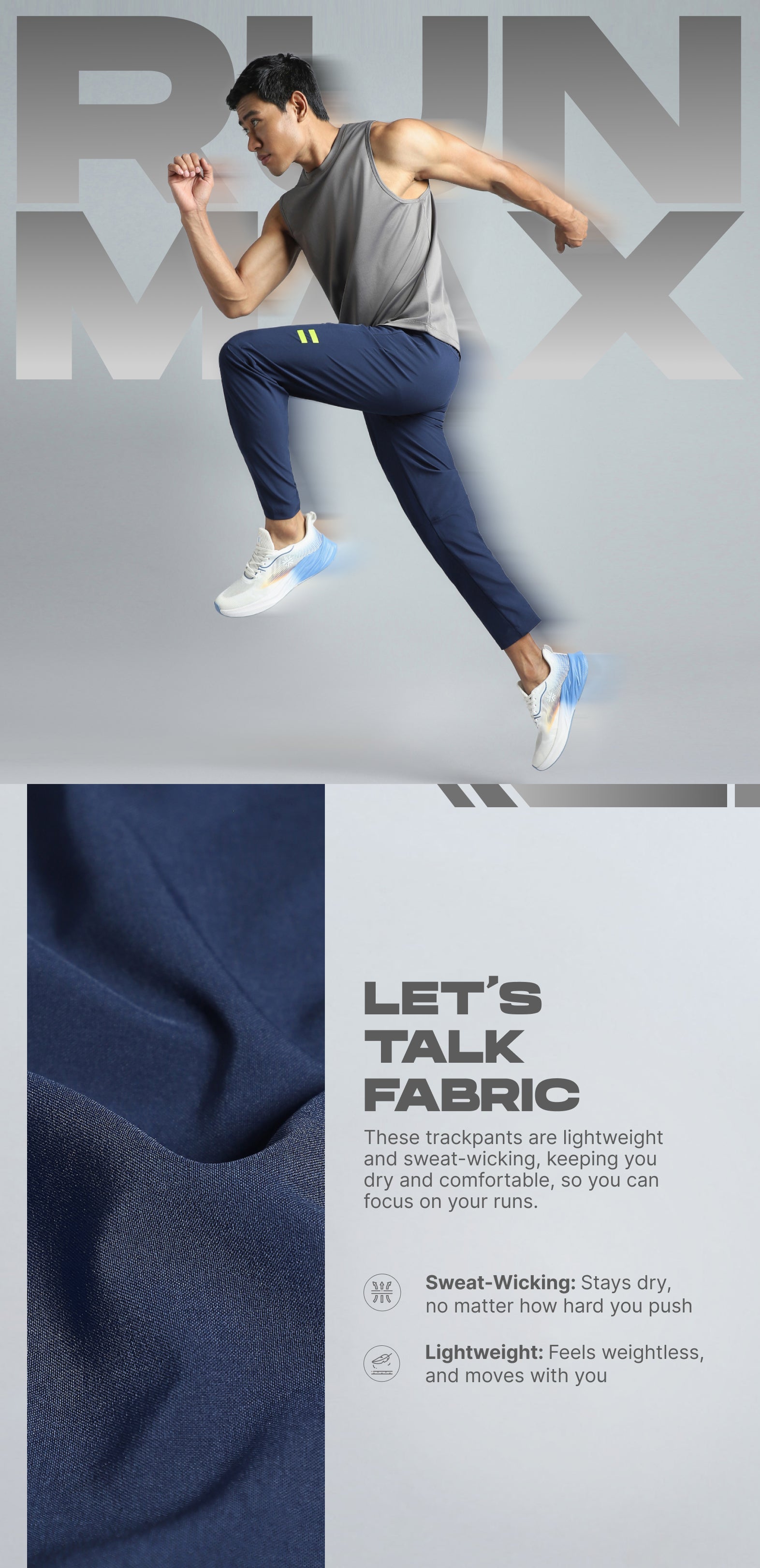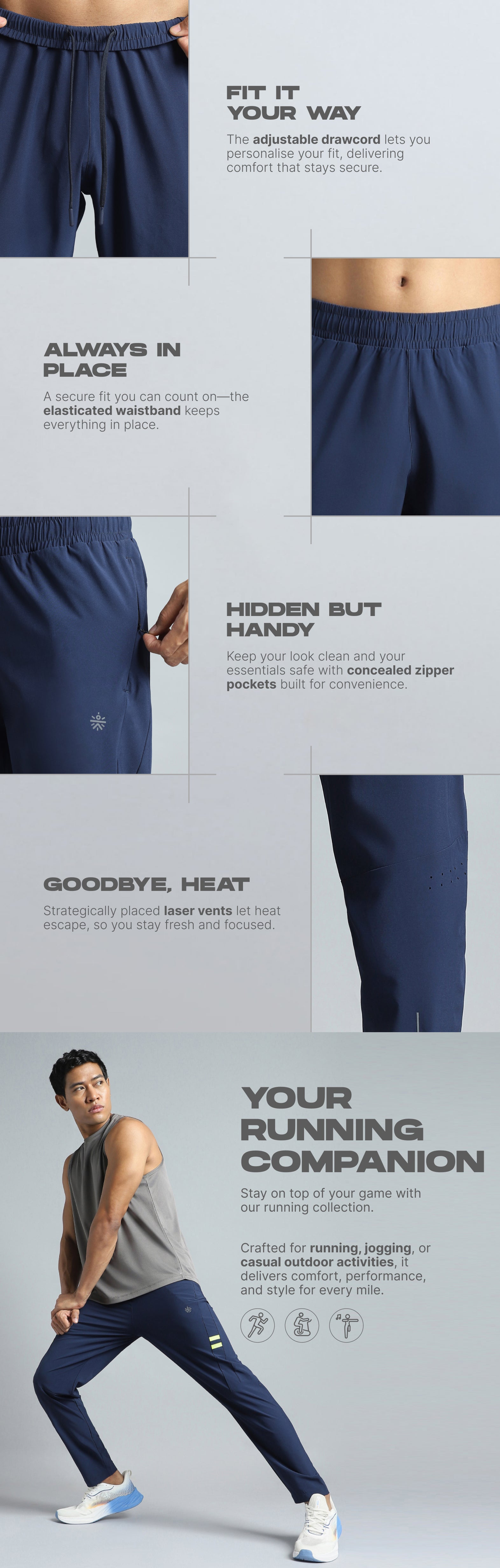 Men's Navy Pacer Running Trackpants is made to move freely with you. Crafted with lightweight fabric and FLY-DRY™ tech, they wick away sweat to keep you cool and dry. The elasticated waistband and inner drawcord offer a snug, secure fit. The concealed pockets keep essentials close, while laser vents at the back enhance breathability. The strategically placed seams support free and natural movement.