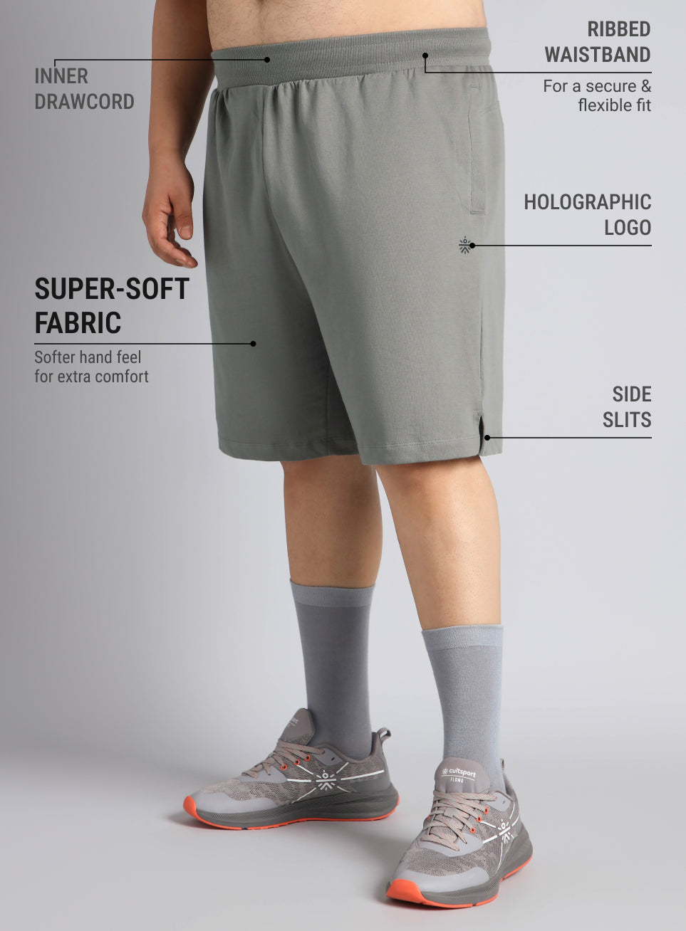 Step into laid-back comfort with the Men's Grey Plus Size Training Essential Shorts—easy to wear, easy to love. Made from super-soft fabric, they feel gentle and smooth on your skin. The ribbed waistband with inner drawcord ensures a secure, flexible fit. The side slits offer added ease of movement, while the holographic logo adds a bold touch.