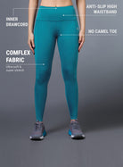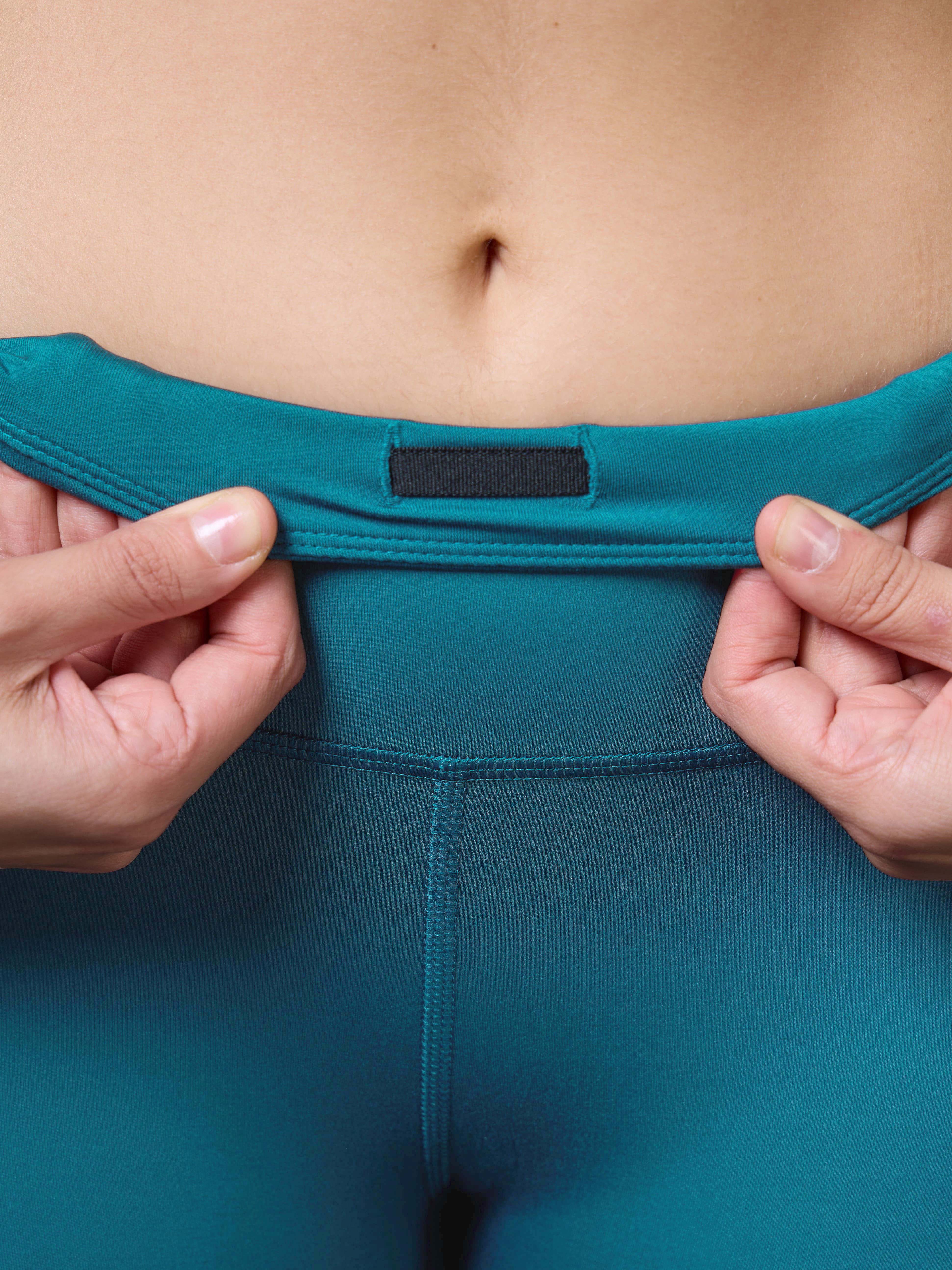 Experience ultra comfort with Women's Teal Runner's Essential Tights. Crafted from ultra-comfy COMFlex fabric for a smooth, flexible fit. Features an anti-slip high waist and inner drawcord ensuring a secure fit, while side pockets help to keep your essentials safe. Designed with a no camel toe offers sleek look and a reflective logo to help with visibility.