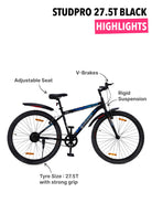 Mechanical V Brakes provide efficient, superior, and reliable braking performance. They can achieve perfect braking even in steep downhills and wet environments so you can confidently ride your bike in tough conditions || All-Terrain tires handle pavement, gravel, and dirt with ease. The tires provide the grip and traction required on extreme courses, wheels feature Single-wall steel rims for lightweight strength and added durability || The bike is equipped with a rigid suspension for a comfortable and relaxing experience. It increases the life of the bike and allows you to confidently ride faster || The bike comes packed with light and strong single wall rims along with 27.5 inches wide tyres that supports comfortable riding and a major performance advantage on the road || Easily adjustable saddle height and an attractive grip offer superior comfort and well cushioned ride. || Enjoy a quick ride to your work space, neighborhood rides, or trails on this cultsport stud pro || 1 Year Warranty On Frame and 6 months Domestic Warranty on Manufacturing Defects