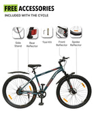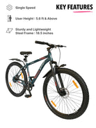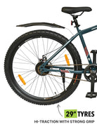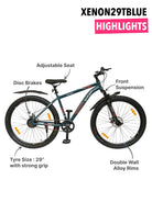 The High-quality double disc brakes on both front and rear wheels ensure stable and quick braking. The disc brakes help you navigate safely during challenging situations such as a crowded market.|| The bike comes packed with light and strong double walled alloy rims along with 29 inches wide tyres that supports comfortable riding and a major performance advantage on the road.|| Easily adjustable saddle height and an attractive grip offer superior comfort and well cushioned ride. The seat height can be adjusted without using any tools.|| Made from high quality steel frame these bikes are durably made to long last offering you excellent service life. Enjoy a quick ride to your work space, neighborhood rides, or trails on this Cultsport XENON29TBLUE.|| The front suspension provides stability to the bicycle and can absorb any bumps and dips encountered on your path for a smoother ride . It also provides strong pedal powers for strong acceleration on straight surfaces and uphill climbs.|| With a fierce, aggressive design, front suspension and front/rear handbrakes, the Stone Mountain is ready for epic outdoor fun.|| Made of high quality material, sturdy, durable tires with strong grip which can provide strong road support and durability to ensure stable and flexible cycling ||1 Year Warranty On Frame and 6 months Domestic Warranty on Manufacturing Defects