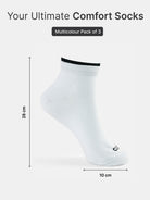 ALL-DAY COMFORT: Crafted from a soft cotton-blended sweat absorbent fabric, these socks give you an ultra-soft feel and keep your feet fresh and comfortable all day. STRETCH THAT MOVES WITH YOU: The stretchable material offers a snug yet flexible fit, adapting to your foot’s shape for all-day ease without slipping or bunching. STRUCTURED FOR COMFORT: Designed with a dual ribbed structure, these socks stay in place and add a touch of texture for better grip and fit around the ankles. ZERO IRRITATION: Reinforced toe stitching enhances durability and maintains structure, with zero irritation and smooth finish. PACK OF 3 : These ankle-length socks are ideal for everyday wear. With a versatile multicolor set of three, they're your go-to choice for pairing with sneakers or casual shoes.