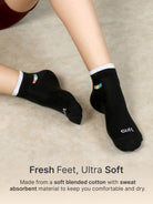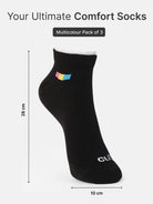 ALL-DAY COMFORT: Made with a soft cotton-blend fabric that feels gentle on the skin—perfect for daily wear, whether you're on the move or relaxing. ZERO IRRITATION: Reinforced toe stitching enhances durability and maintains structure, with zero irritation and smooth finish. STRETCH THAT MOVES WITH YOU: The 4-way stretch fabric ensures a flexible, secure fit that adapts to your movement without slipping. STRUCTURED FOR EASE: Designed with a ribbed inner band at the top, these socks stay in place without slipping—delivering soft grip and lasting comfort. PACK OF 3: With a versatile multicolour pack of 3, these ankle-length socks are your go-to choice for pairing with sneakers or casual shoes.