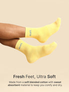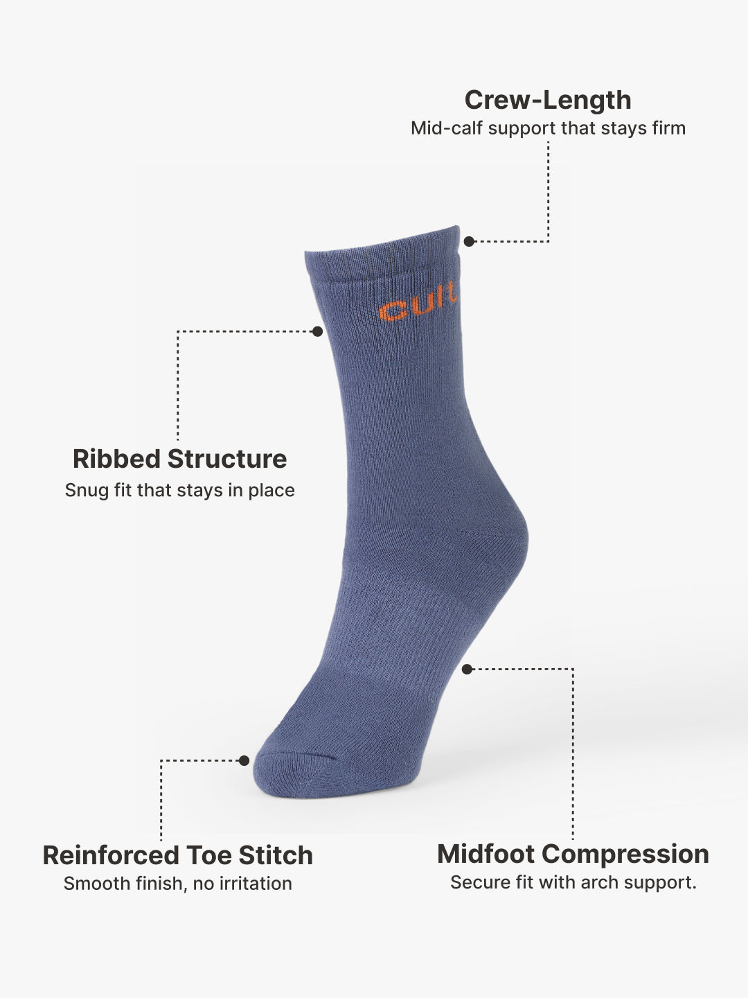 ALL-DAY COMFORT: Crafted from a soft cotton-blended and sweat absorbent fabric, these socks give you an ultra-soft feel and keep your feet dry even through intense activity. ENGINEERED FOR SUPPORT Designed for athletes in motion, these socks feature midfoot compression for a secure fit and enhanced arch support, while reinforced toe stitching delivers zero irritation. STRETCH THAT KEEPS UP: Workout without any slip with the 4-way stretchable fabric that moves with your feet—delivering a snug fit that helps you during your game. STRUCTURED FOR PERFORMANCE: Enjoy a strong grip and better performance with a extended ribbed top design that offers a firm, snug fit around the calves, while the 4-way stretch ensures flexible movement without slipping. PACK OF 3: Comes in a pack of 3, these crew-length sports socks with multicolour options are designed for high performance and comfort.