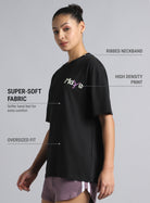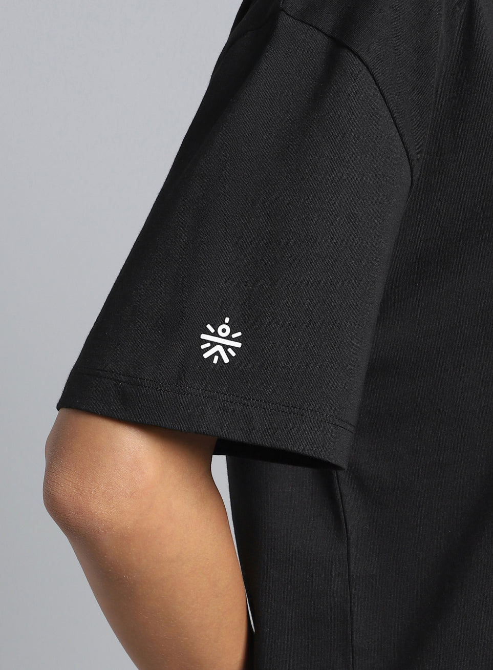Add a playful pop of colour to your wardrobe with the Women's Black Move Oversized T-shirt, crafted to bring style and ease to your everyday look. The super-soft 100% cotton fabric is gentle on your skin and delivers all-day comfort with a luxurious feel. The ribbed neckband holds its shape for a neat finish, while the oversized fit brings relaxed, laid-back vibes.
