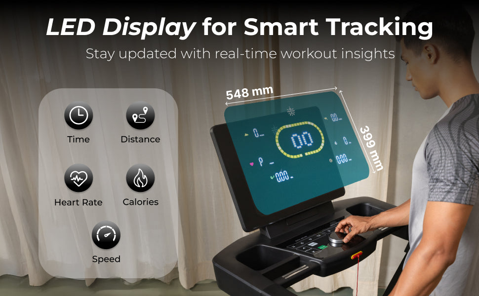 - [Advanced Features]- • 20 Preset Programs • LED display showing Time-Speed-Distance-Calorie • Heart rate sensor
