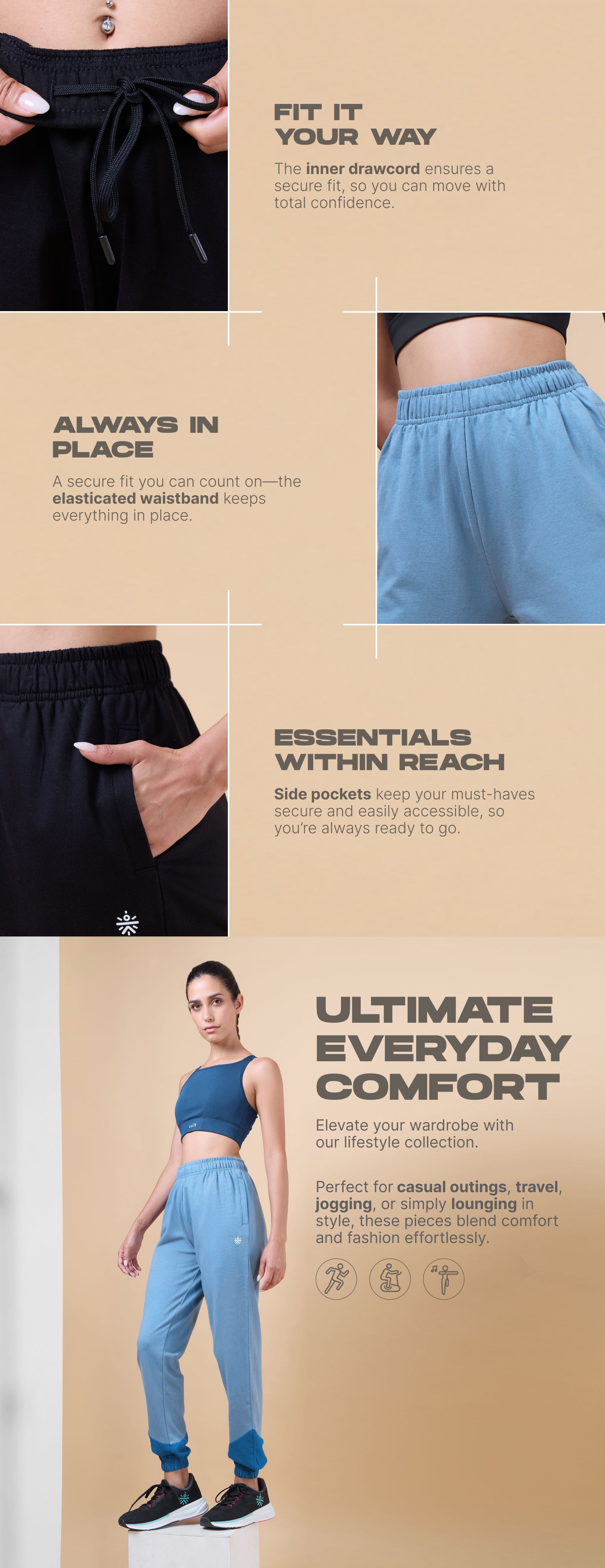 Ease into comfort with the Women's Black Play in Leisure Joggers. Made from super-soft fabric, they feel smooth and gentle against the skin. The elasticated waistband provides a secure fit, while the inner drawcord allows easy adjustments. The side pockets keep essentials close, and the elasticated cuffs ensure a snug fit that stays in place.