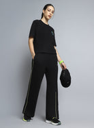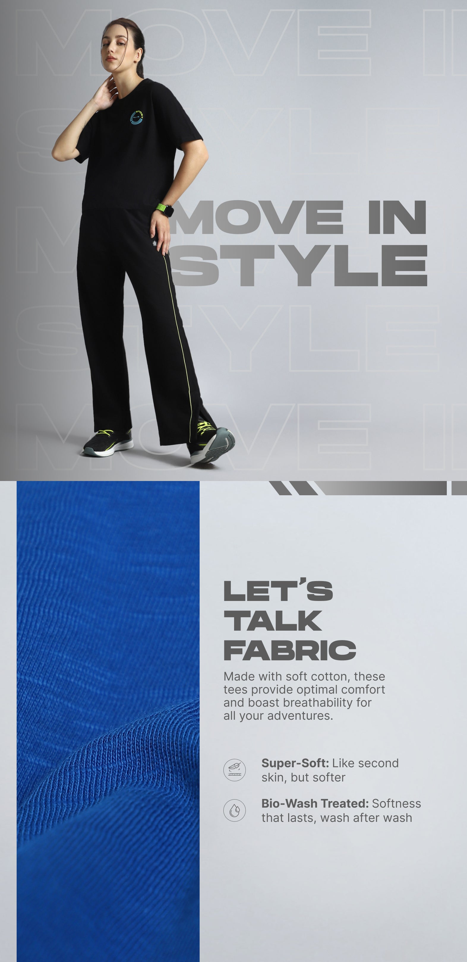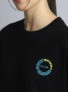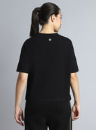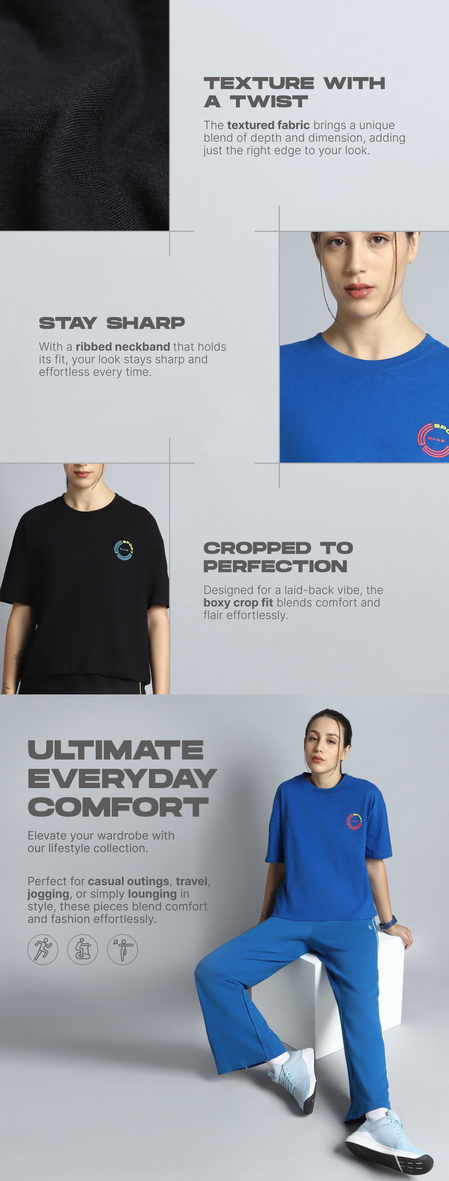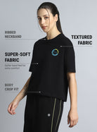 Own your look with the Women's Black Sports Club T-shirt. The super soft fabric keeps you comfy all day, while the textured finish adds an easy style lift. The ribbed neckband ensures lasting shape and structure. Cut to a boxy crop fit, it’s the perfect match for high-waisted tights or relaxed joggers.