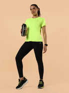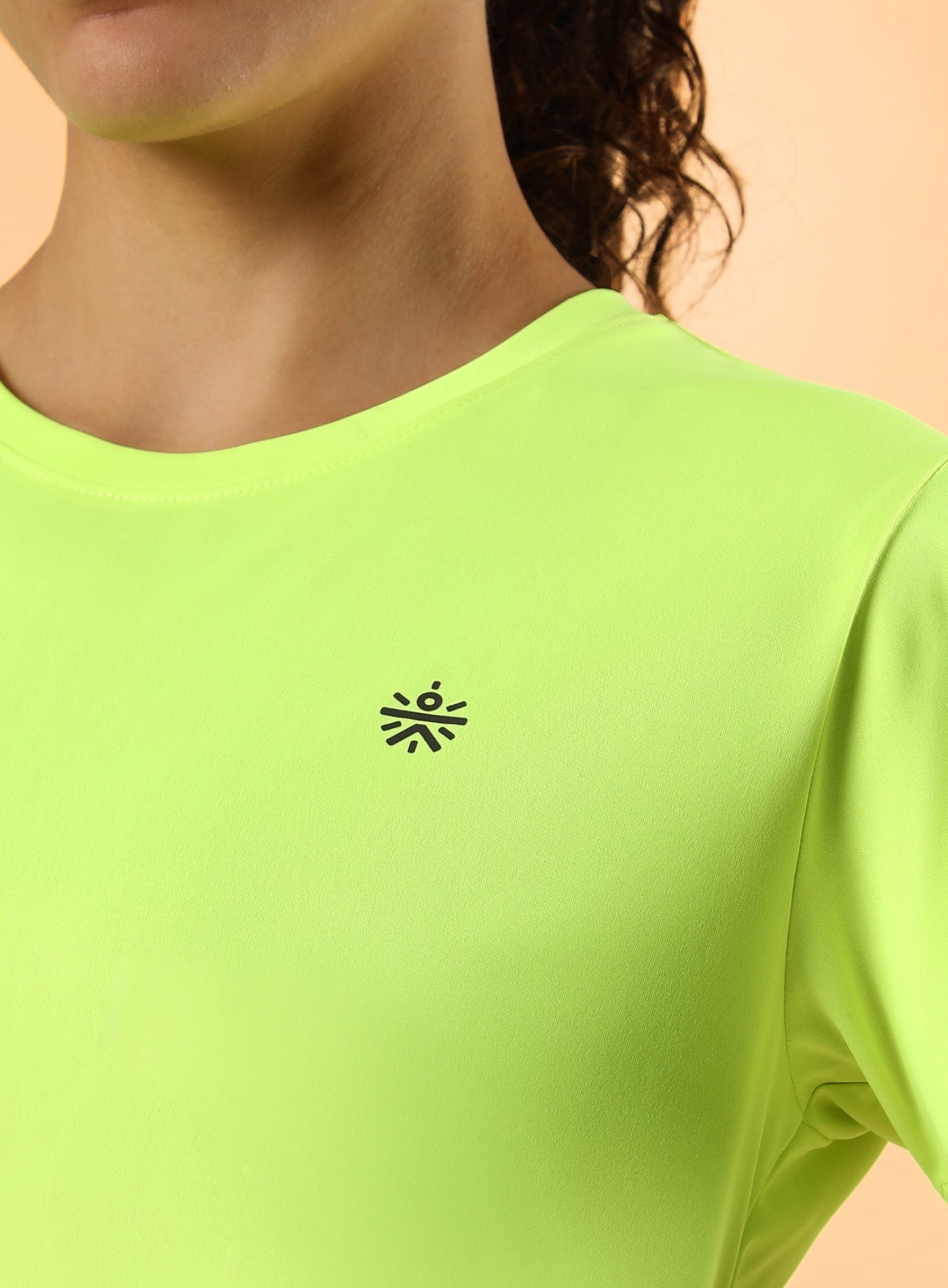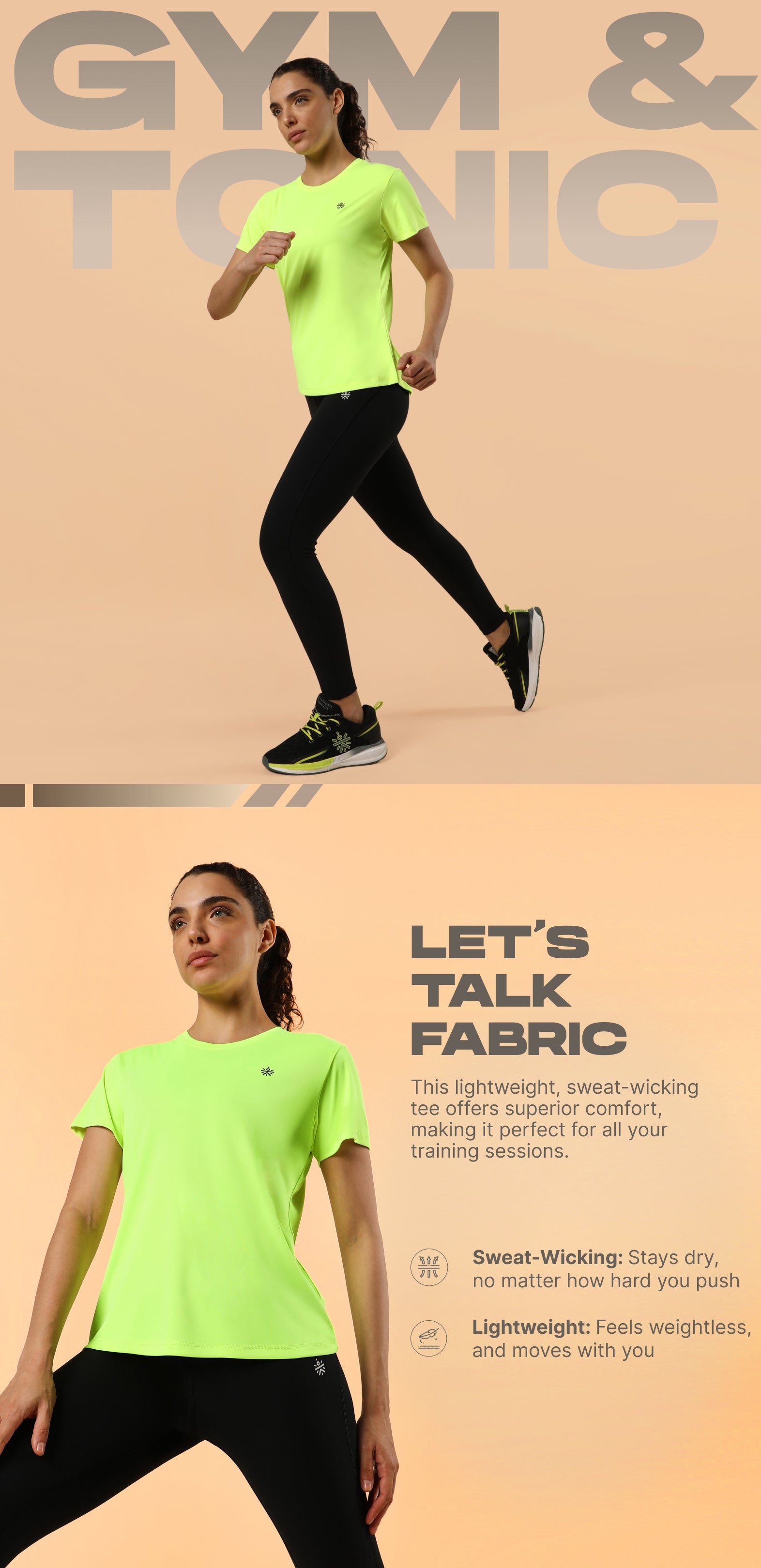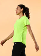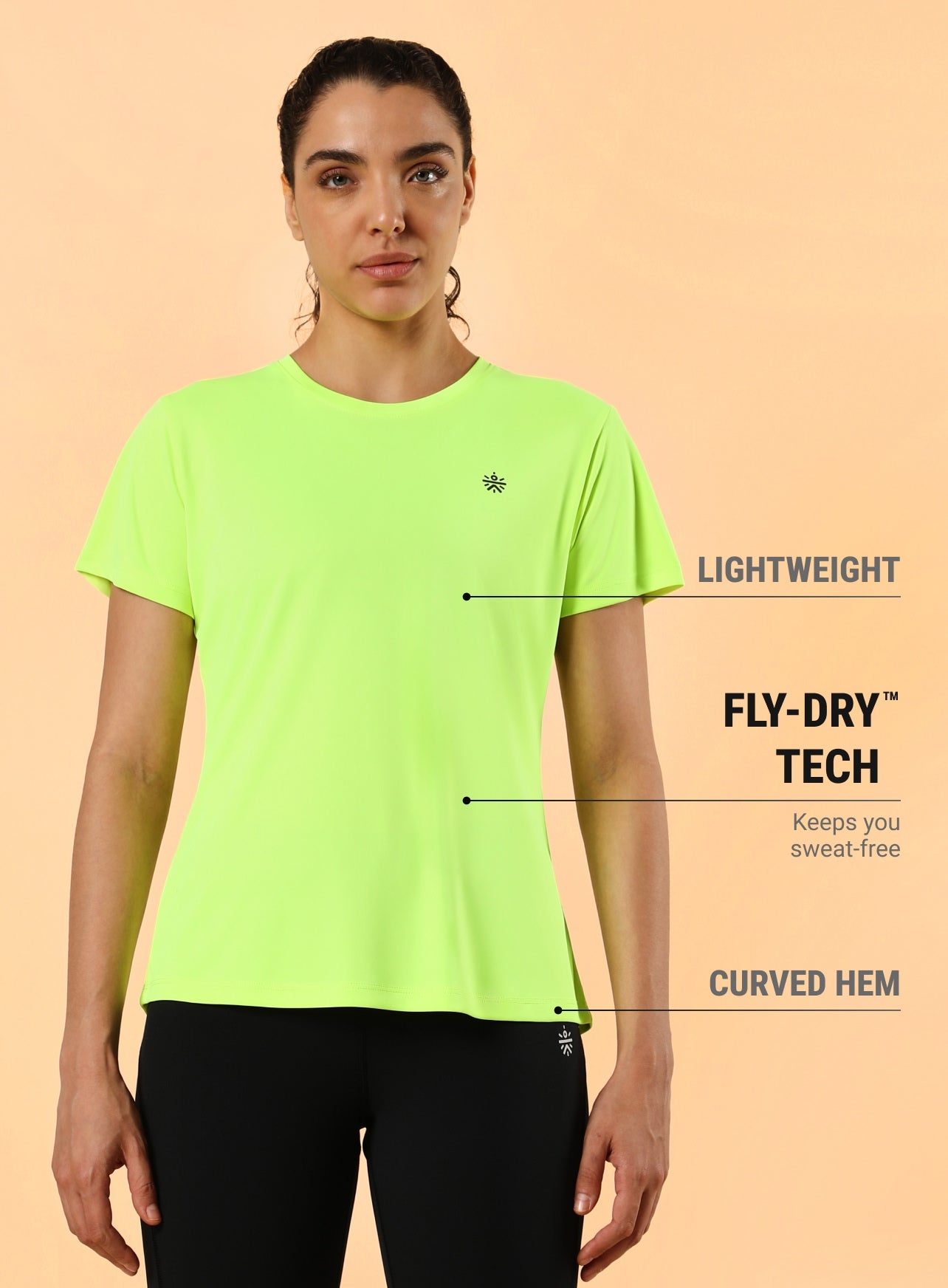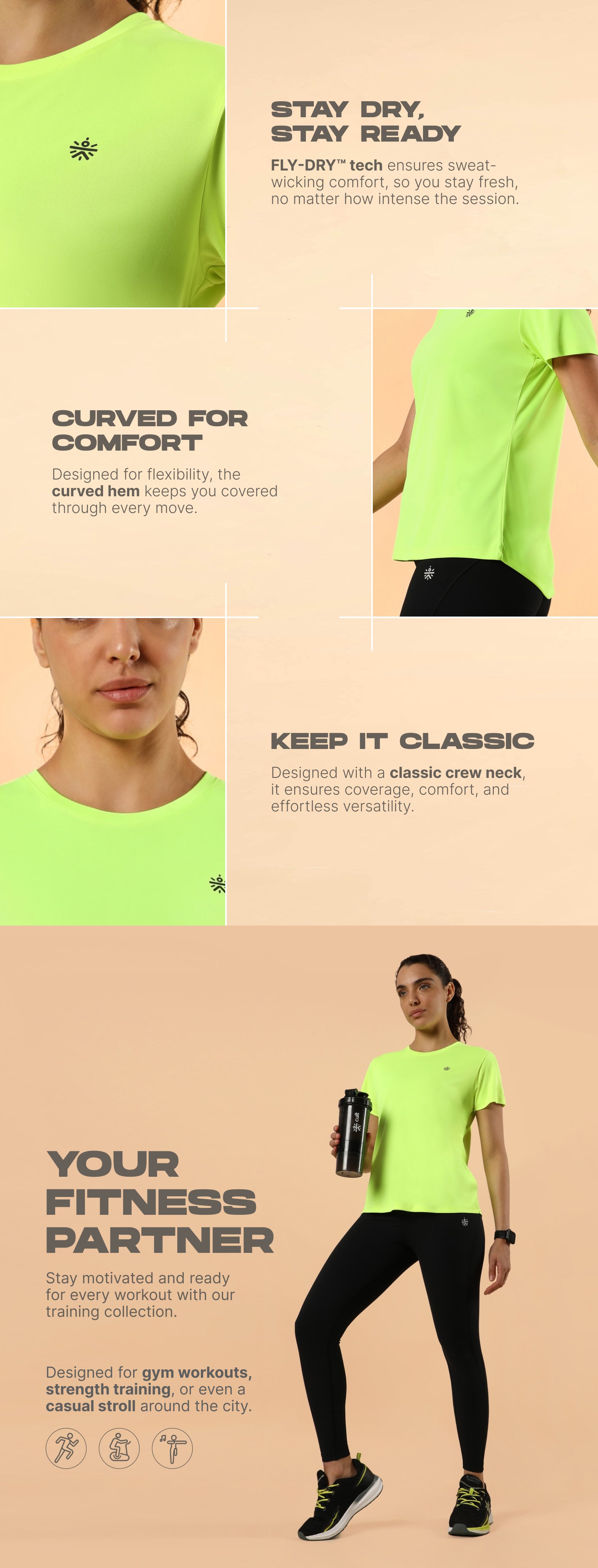 Stay light, stay ready in the Women's Neon Green Training T-shirt. Crafted with FLY-DRY™ tech, it wicks away sweat to keep you dry and focused. The lightweight fabric ensures ease of movement, while the curved hem provides extra coverage for every stretch and stride.