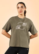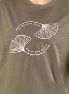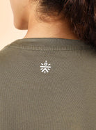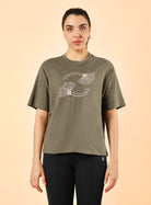 Flow through your day in the Women's Olive Pause and Align Printed T-shirt. Made from super-soft fabric, it feels smooth and gentle against the skin. The relaxed fit offers a comfy, easygoing vibe, while the ribbed neckband adds a classic touch. The bold graphic print makes a statement, bringing a standout edge to your yoga and beyond.