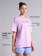 Own the laid-back look with the Women's Purple Graphic Oversized T-shirt, built for easy comfort on any day. The super-soft fabric feels smooth against your skin, making it perfect for all-day wear. The ribbed neckband keeps the shape intact while adding durability. The tee is finished with a high-density print for a standout design and an oversized fit that nails effortless style.
