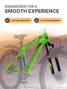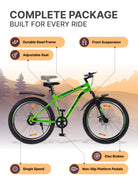 The bike has a sturdy and reliable steel frame that can brave rough riding conditions and terrains. The top-notch construction quality ensures that the bike has a long lifespan.|| The bike comes packed with light and strong double walled alloy rims along with 26 inches wide tyres that supports comfortable riding and a major performance advantage on the road. || Easily adjustable saddle height and an attractive grip offer superior comfort and well cushioned ride.||The High-quality double disc brakes on both front and rear wheels ensure stable and quick braking. The disc brakes help you navigate safely during challenging situations such as a crowded market.||The front suspension provides stability to the bicycle and can absorb any bumps and dips encountered on your path for a smoother ride . It also provides strong pedal powers for strong acceleration on straight surfaces and uphill climbs|| 1 Year Warranty On Frame and 6 months Domestic Warranty on Manufacturing Defects
