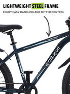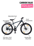 The front suspension provides stability to the bicycle and can absorb any bumps and dips encountered on your path for a smoother ride . It also provides strong pedal powers for strong acceleration on straight surfaces and uphill climbs||The bike comes packed with light and strong double walled alloy rims along with 27.5 inches wide tyres that supports comfortable riding and a major performance advantage on the road || Easily adjustable saddle height and an attractive grip offer superior comfort and well cushioned ride. The seat height can be adjusted without using any tools ||The High-quality double disc brakes on both front and rear wheels ensure stable and quick braking. The disc brakes help you navigate safely during challenging situations such as a crowded market.||Made of high quality material, sturdy, durable rubber tires with strong grip which can provide strong road support and durability to ensure stable and flexible cycling|| 1 Year Warranty On Frame and 6 months Domestic Warranty on Manufacturing Defects || Made from high quality steel frame these bikes are durably made to long last offering you excellent service life. Enjoy a quick ride to your work space, neighborhood rides, or trails on this cultsport Carbide Cycle