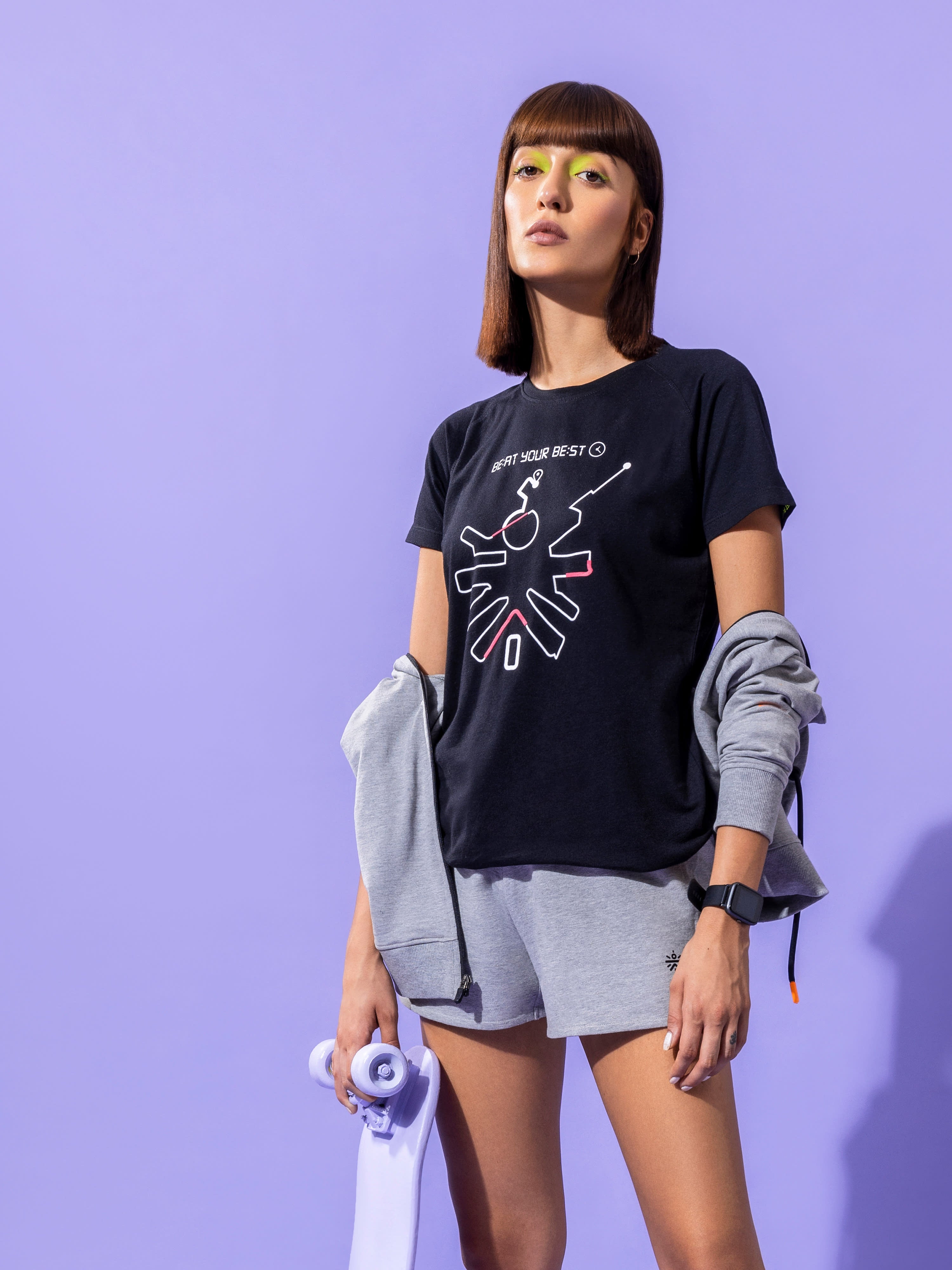 This minimal print graphic T-shirt is simple, super comfortable, and functional. It is made with a supersoft and breathable fabric. Choose your favorite tone, pair it with the shorts or leggings of your choice, and you're all set to look and feel fit-tastic during your next workout session!
