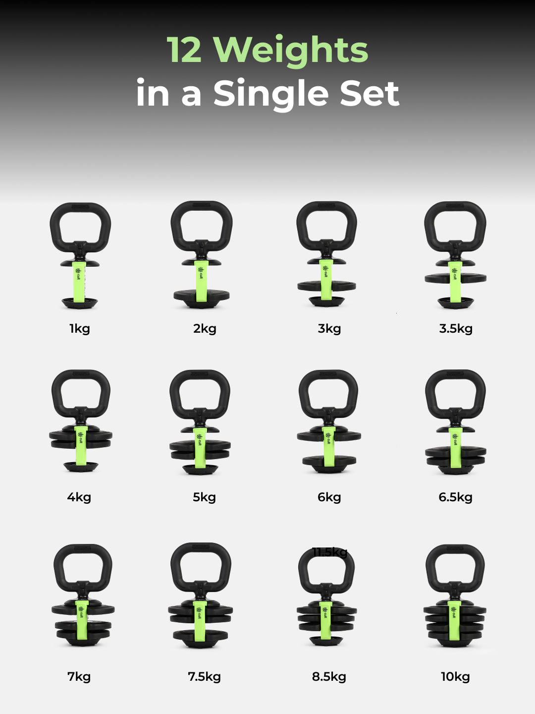- [12 Weight Options in One Kettlebell]: Adjust weights between 1kg, 2kg, 3kg, 3.5kg, 4kg, 5kg, 6kg, 6.5kg, 7kg, 7.5kg, 8.5kg, and 10kg perfect for beginners to advanced users