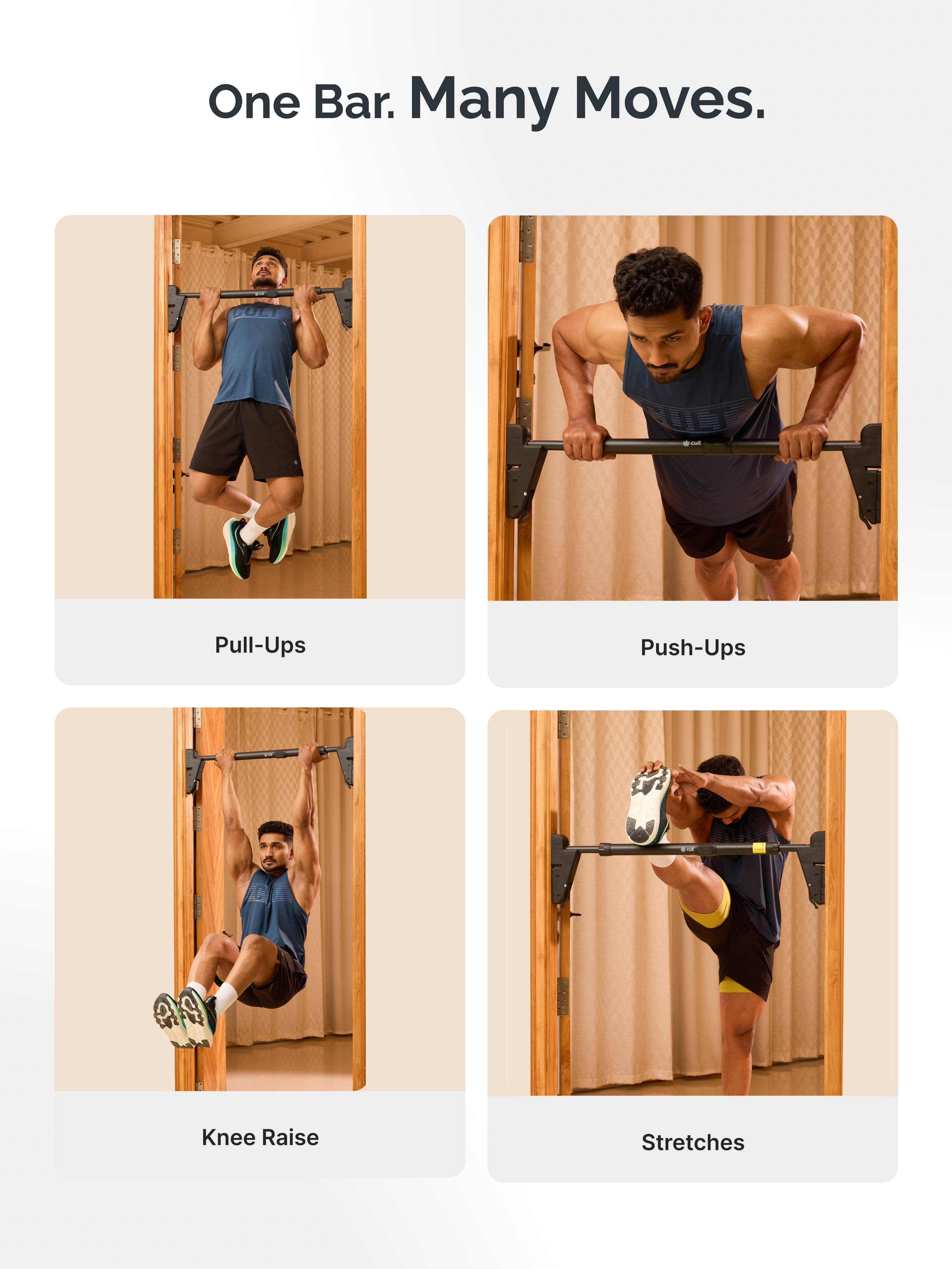 The Cult Pull-Up Bar is a versatile and sturdy home-workout essential designed to help you build upper-body strength with ease. Crafted from high-strength steel, it offers excellent load-bearing capacity and long-lasting durability for daily training. The ergonomic, non-slip foam grips ensure a comfortable and secure hold, reducing hand fatigue during intense workouts. Easy to install on most standard door frames without drilling, this pull-up bar supports a wide range of exercises including pull-ups, chin-ups, hanging leg raises, push-ups, and stretches.