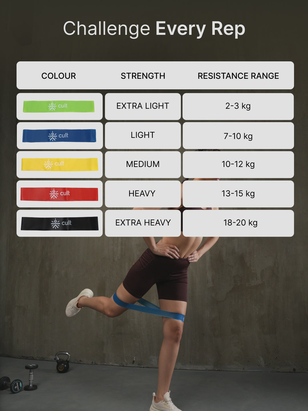 5 RESISTANCE LEVELS: Tailored for every fitness goal, the set includes five resistance levels—Green for extra light (2–3 kg), Blue for light (7–10 kg), Yellow for medium (10–12 kg), Red for heavy (13–15 kg), and Black for extra heavy (18–20 kg).