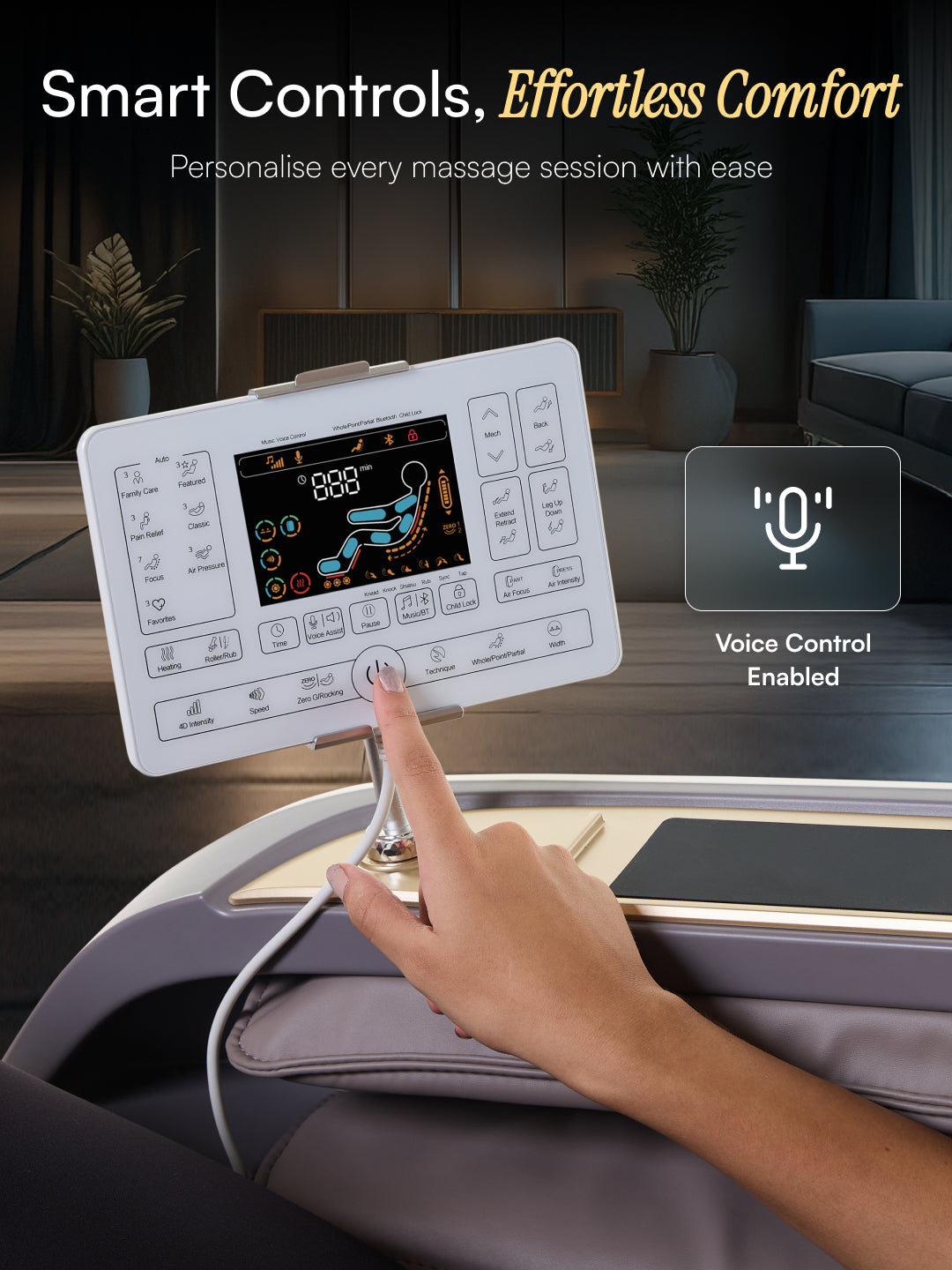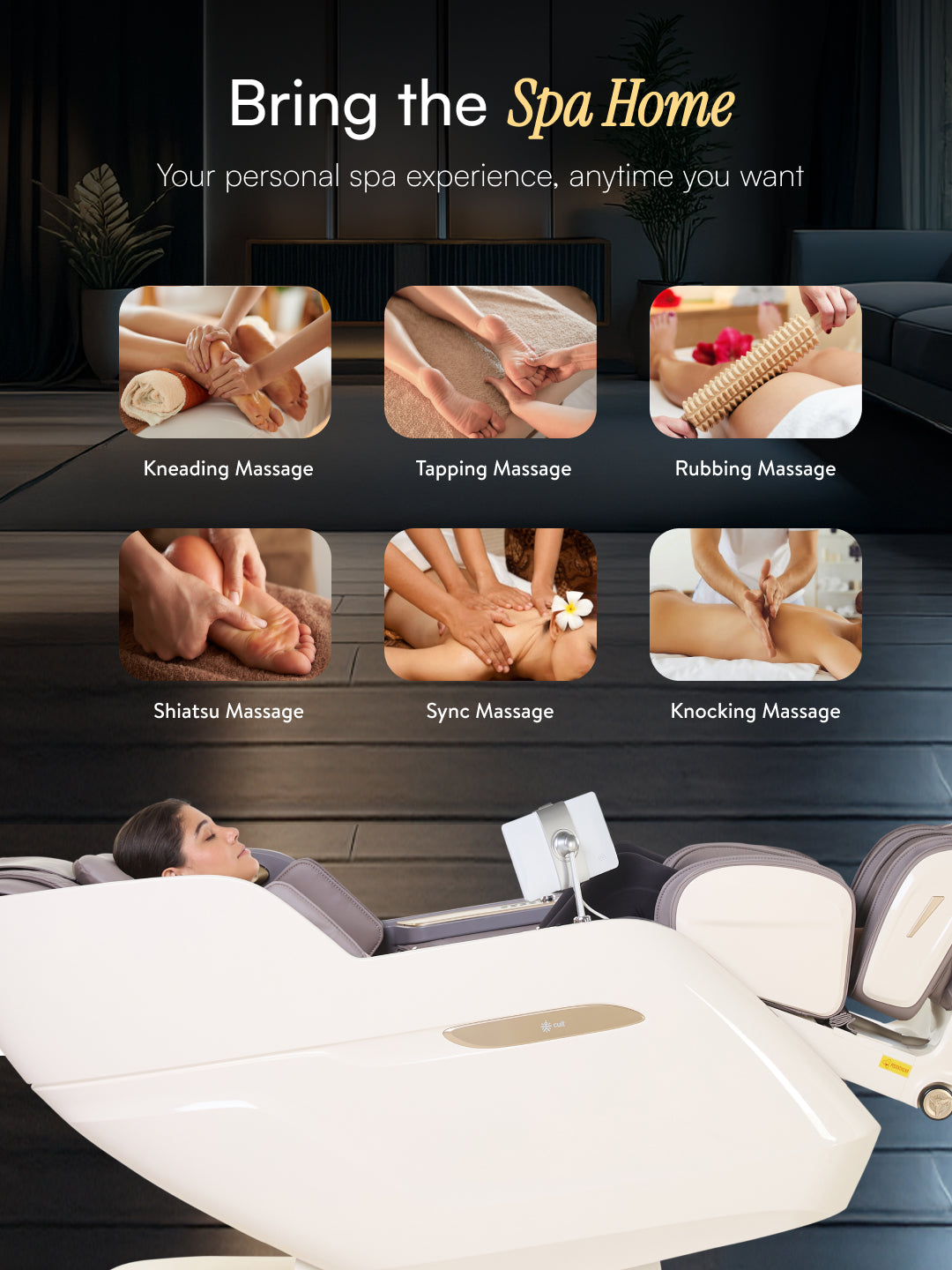 - [Massage Techinques]-(i) 4D Neck Lift - Neck Massage (ii) 4D Shoulder Relax - Shoulder pressure relief (iii) 4D Spinal Shiatsu - Back Soothing (iv) 4D Back Push - Lower back care (v) Kneading (vi) Tapping (vii) Shiatsu (viii) Rubbing (xi) Sync (x) Knocking