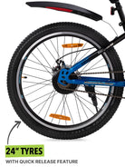 Mechanical Disc Brakes provide efficient, superior, and reliable braking performance. They can achieve perfect braking even in steep downhills and wet environments so you can confidently ride your bike in tough conditions || All-Terrain tires handle pavement, gravel, and dirt with ease. The tires provide the grip and traction required on extreme courses, wheels feature double-wall aluminum rims for lightweight strength and added durability || The bike is equipped with a front suspension for a comfortable and relaxing experience. The front shocks do a great job of absorbing bumps which increases the life of the bike and allows you to confidently ride faster || The frame is made of Steel for strong support strength. The Mountain Bike is right for you if you want to ride what the pros ride. This bike is built for shocking speed and capability on even the hardest courses || The bike comes packed with light and strong double walled alloy rims along with 24 inches wide tyres that supports comfortable riding and a major performance advantage on the road. || Easily adjustable saddle height and an attractive grip offer superior comfort and well cushioned ride. The seat height can be adjusted without using any tools || Enjoy a quick ride to your work space, neighborhood rides, or trails on this cultsport Dauntless || 1 Year Warranty On Frame and 6 months Domestic Warranty on Manufacturing Defects