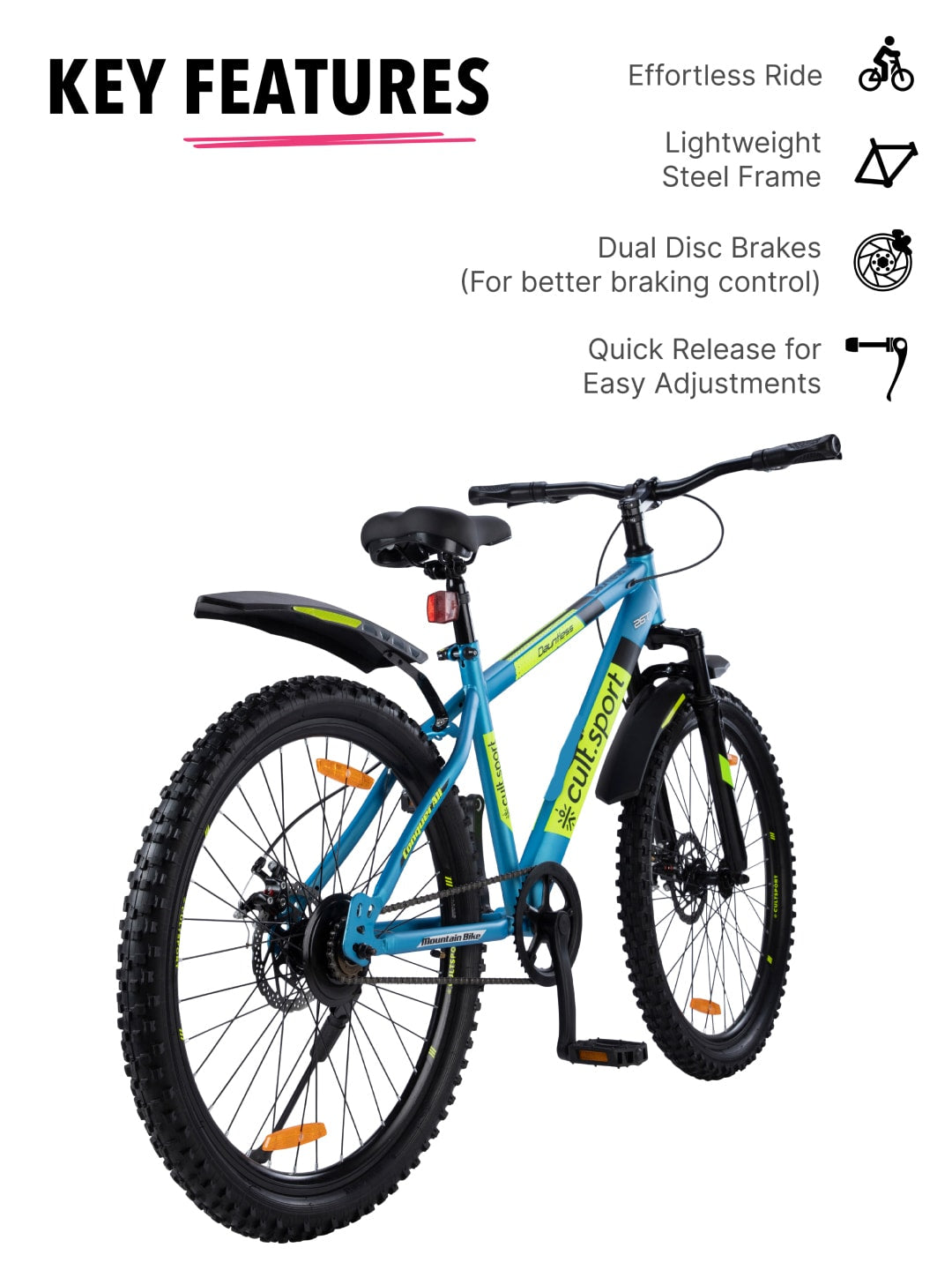 Made from high quality Steel frame and these bikes are durably made to long last offering you excellent service life. Enjoy a quick ride to your work space, neighborhood rides, or trails on this cultsport Dauntless Single Speed Cycle || Easily adjustable saddle height and an attractive grip offer superior comfort and well cushioned ride. The seat height can be adjusted without using any tools || The bike comes packed with light and strong double walled alloy rims along with 26 inches wide tyres that supports comfortable riding and a major performance advantage on the road || The steel frame provides solid performance and efficiently transfers pedal power for strong acceleration on straight surfaces and uphill climbs || The suspension fork absorbs any bumps and dips encountered on your path for a smoother-feeling ride. The removable rear derailleur guard protects the gears from any unintentional damage. Front and rear steel linear pull handbrakes provide consistent, dependable stopping action on demand || The slight-rise handlebar enables upright riding to minimize back and shoulder strain. With a fierce, aggressive design, front suspension and front/rear handbrakes, the Stone Mountain is ready for epic outdoor fun || 1 Year Warranty On Frame and 6 months Domestic Warranty on Manufacturing Defects