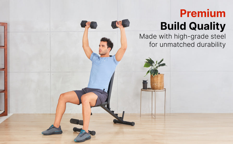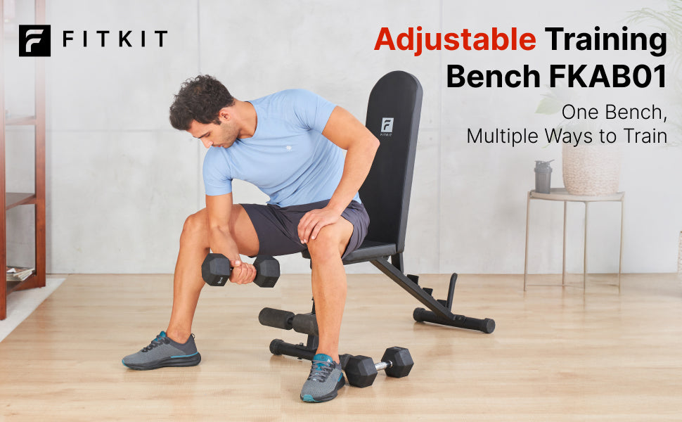 The FITKIT by Cult FKAB01 Adjustable Bench is designed for intense home workouts; offering a heavy-duty mild steel frame with a 350kg weight capacity for superior stability. Its 5 adjustable levels—including flat; incline; decline; and a 90° upright position—allow for a versatile full-body workout. The high-density Litlon cushioning; 12mm plywood base; and premium Rexine upholstery provide maximum comfort and durability. With level adjuster base shoes; foam-padded foot support; and easy assembly; this bench is the perfect addition to your home gym; helping you train like a pro from the comfort of your space! Dumbbells are not included in the package.