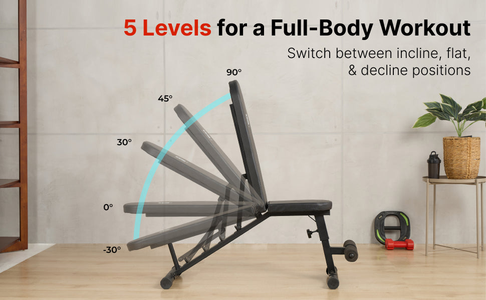 - Adjustment Angles (degree): 90° Chair Position- 45° Incline Position- 30° Incline Position- 0° Flat Position- 30° Decline Position