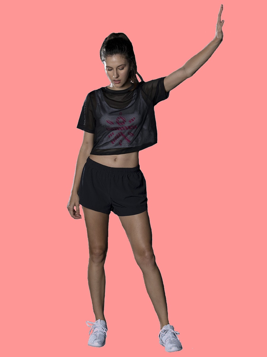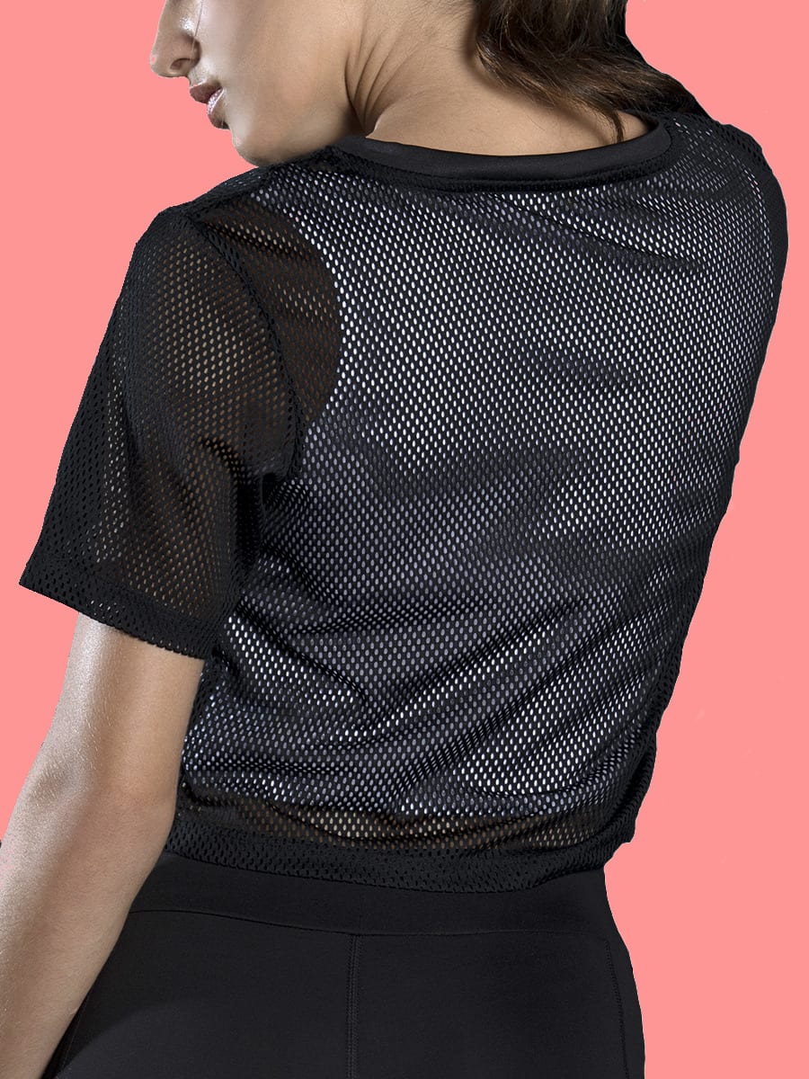 Pair this relaxed fit double layered trendy mesh cropped top with a skirt, joggers, shorts or leggings for a workout or a casual outing.
