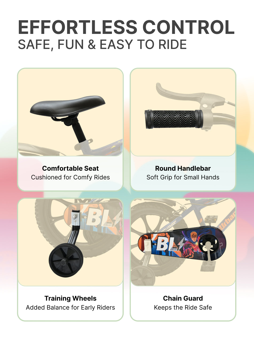 The kids cycle strikes a good balance between size, weight, and features, making it an excellent choice for children who have outgrown smaller bikes . It supports their development as confident riders while ensuring safety and enjoyment during their cycling adventures|| Easy to Handle: The smaller wheel size (16 inches) makes these bikes lightweight and easy for young children to maneuver. This is crucial for building confidence and coordination as they learn to ride|| Stability: 16-inch bikes often feature a lower center of gravity and a stable wheelbase, which helps prevent tipping and provides stability for new riders. This is reassuring for children who are still mastering their balance.|| Safety Features:This 16-inch bikes come with safety features tailored to kids, that are intuitive for children to use, as well as handlebar grips designed for smaller hands|| Adjustability: We offer adjustable seat posts and handlebars, allowing the bike to grow with the child. This ensures continued comfort and proper fit as they grow taller|| Encourages Outdoor Play: Riding a 16-inch bike encourages children to play outdoors, promoting physical activity and exploration of their surroundings|| Training Wheels: The bikes come with training wheels to help kids learn to balance before transitioning to a two-wheeled bike.|| Chain Guard: To protect clothing and skin from getting caught in the chain .