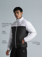 Step out in style with the Men's Black Colorblock Puffer Jacket, designed to keep function and comfort in check. Features a front-open zipper and secure zipper pockets for convenience and easy wear. The inner pocket adds extra storage, while the elasticated waistband and cuffs ensure a snug fit. Finished with a reflective logo for added visibility and a sleek touch. Perfect for workouts or laid-back strolls.