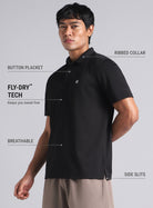 Stay sharp while you sweat in the Men's Black Performance Sculpted Polo T-shirt. Made from FLY-DRY™ fabric that helps wick away sweat to keep you dry. The lightweight feel and breathable design keep you cool through every move. The side slits and seams are strategically built for easy movement. The ribbed collar and button placket hold structure through movement for a sharp and neat finish.