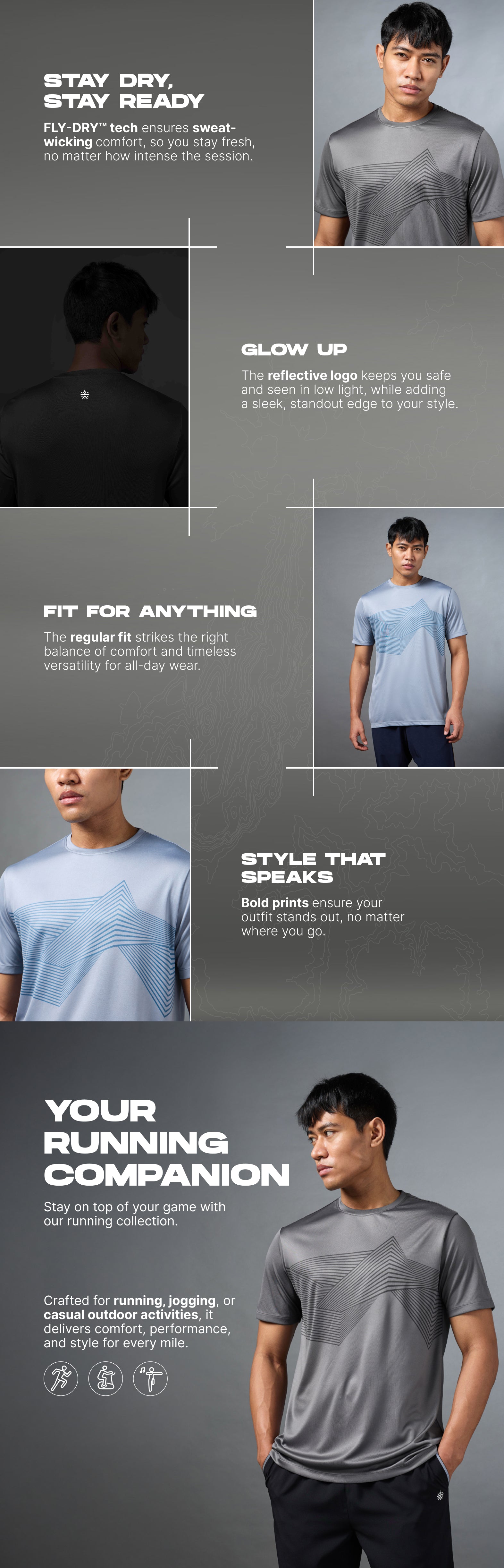 Level up your look with Men's Grey Urban Trail Run T-shirt. Crafted with FLY-DRY™ technology, it wicks away sweat to keep you dry and comfortable. This tee features eye-catching graphics and reflective touches for a look that’s equal parts cool and functional. With its comfortable regular fit, it’s perfect for wherever your day takes you.
