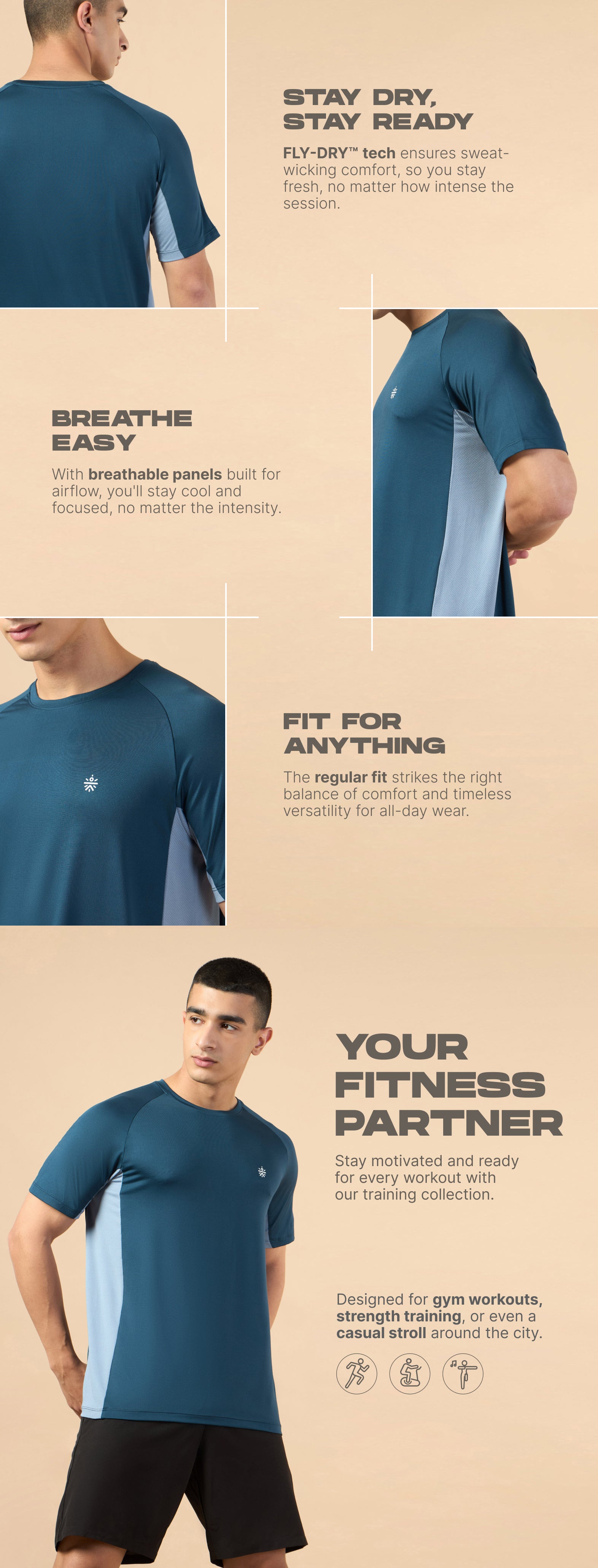 Train hard, stay light with the Men's Navy All Round Training T-shirt. Built for performance, these shorts feature FLY-DRY™ tech that wicks away sweat to keep you cool and dry. The super-stretch design moves with you, while breathable panels boost ventilation for max comfort. This lightweight tee lets you push limits without weighing you down.