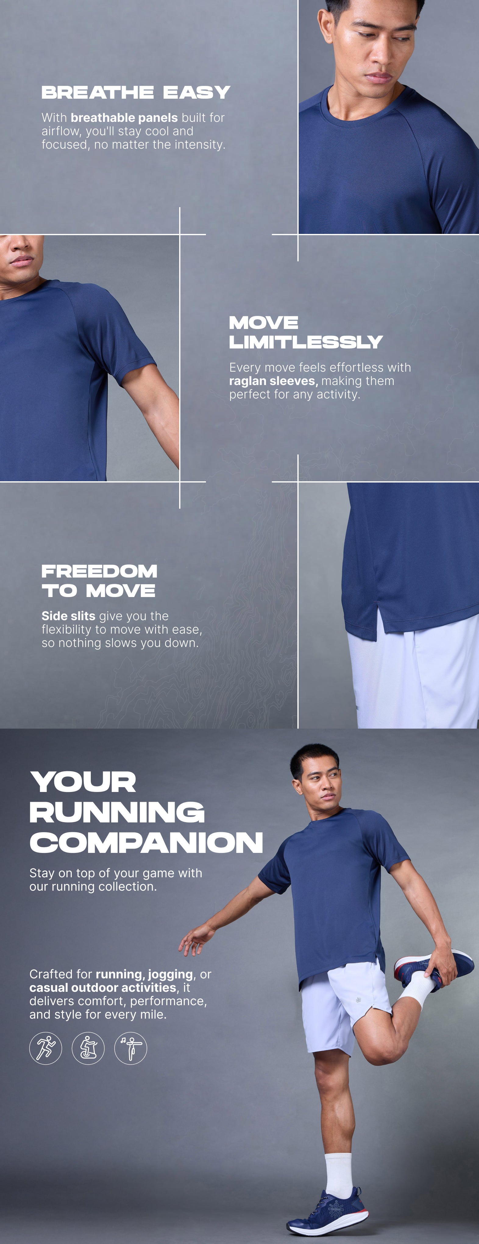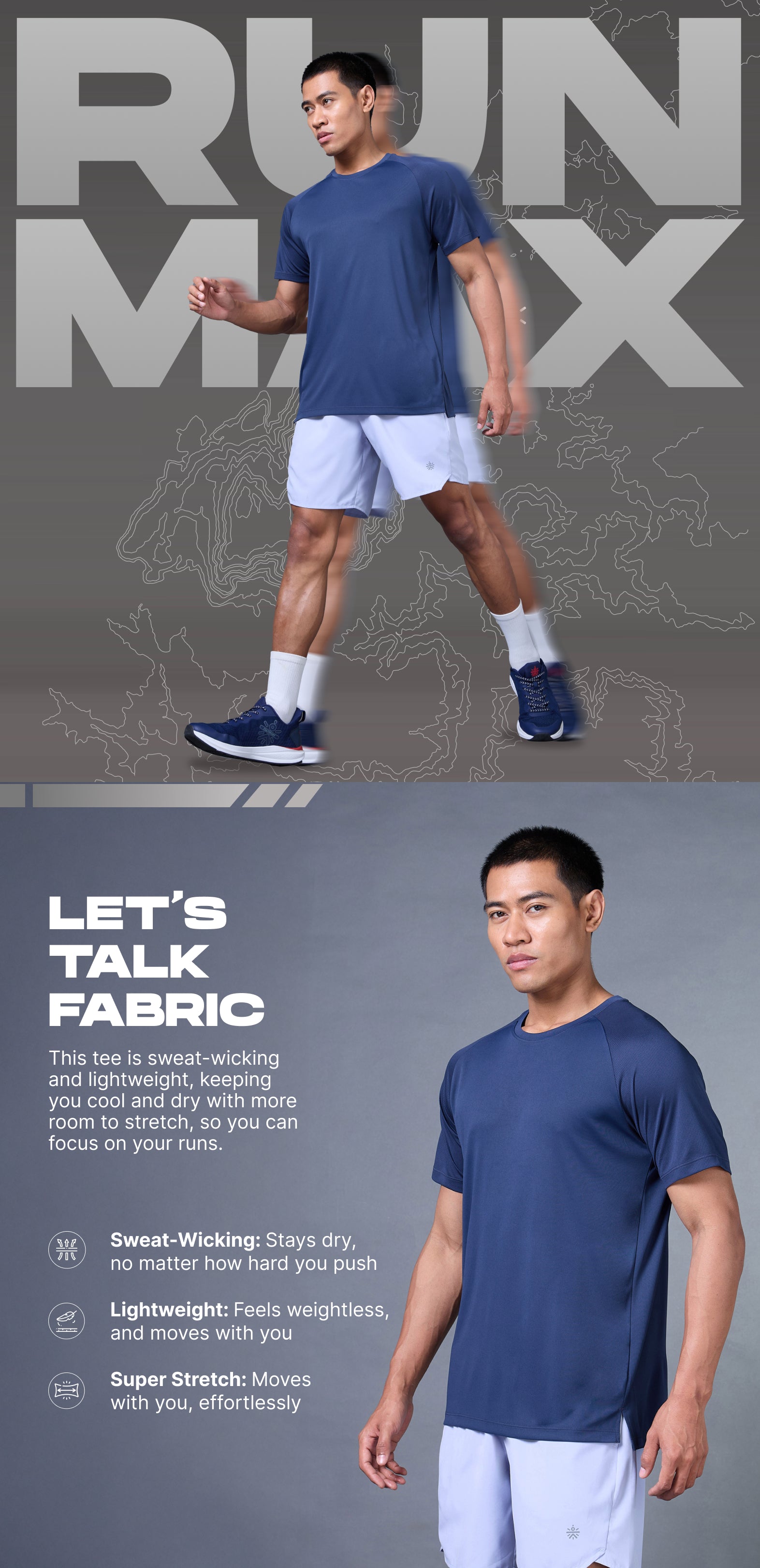 Go the distance in the Men's Navy Run Elevate T-shirt. Powered by FLY-DRY™ tech, this tee wicks away sweat to keep you cool and dry mile after mile. The super-stretch fabric moves with you, while breathable panels on the sleeves amp up airflow. The raglan sleeves give you a natural range of motion, and side slits offer extra flexibility.