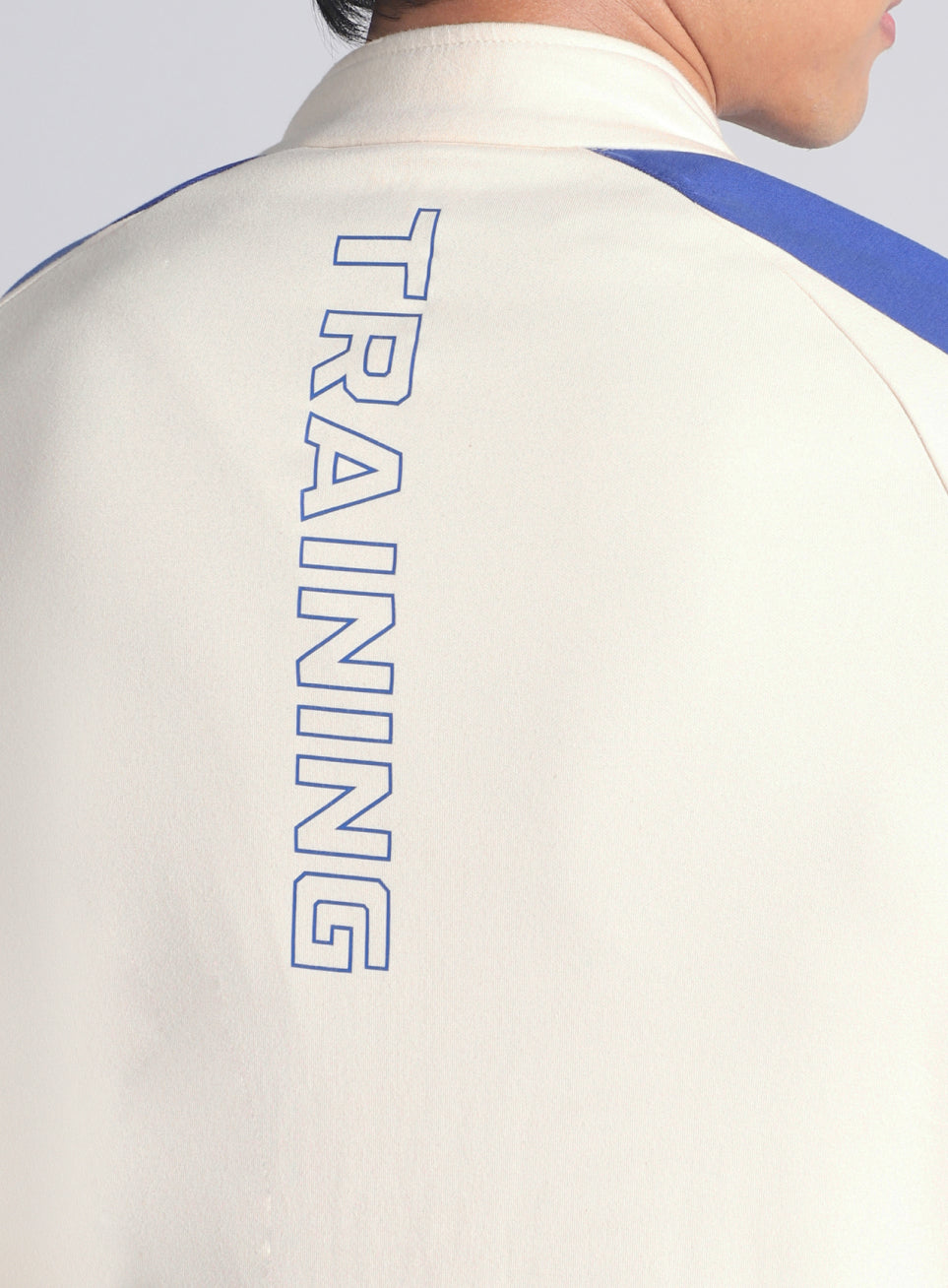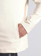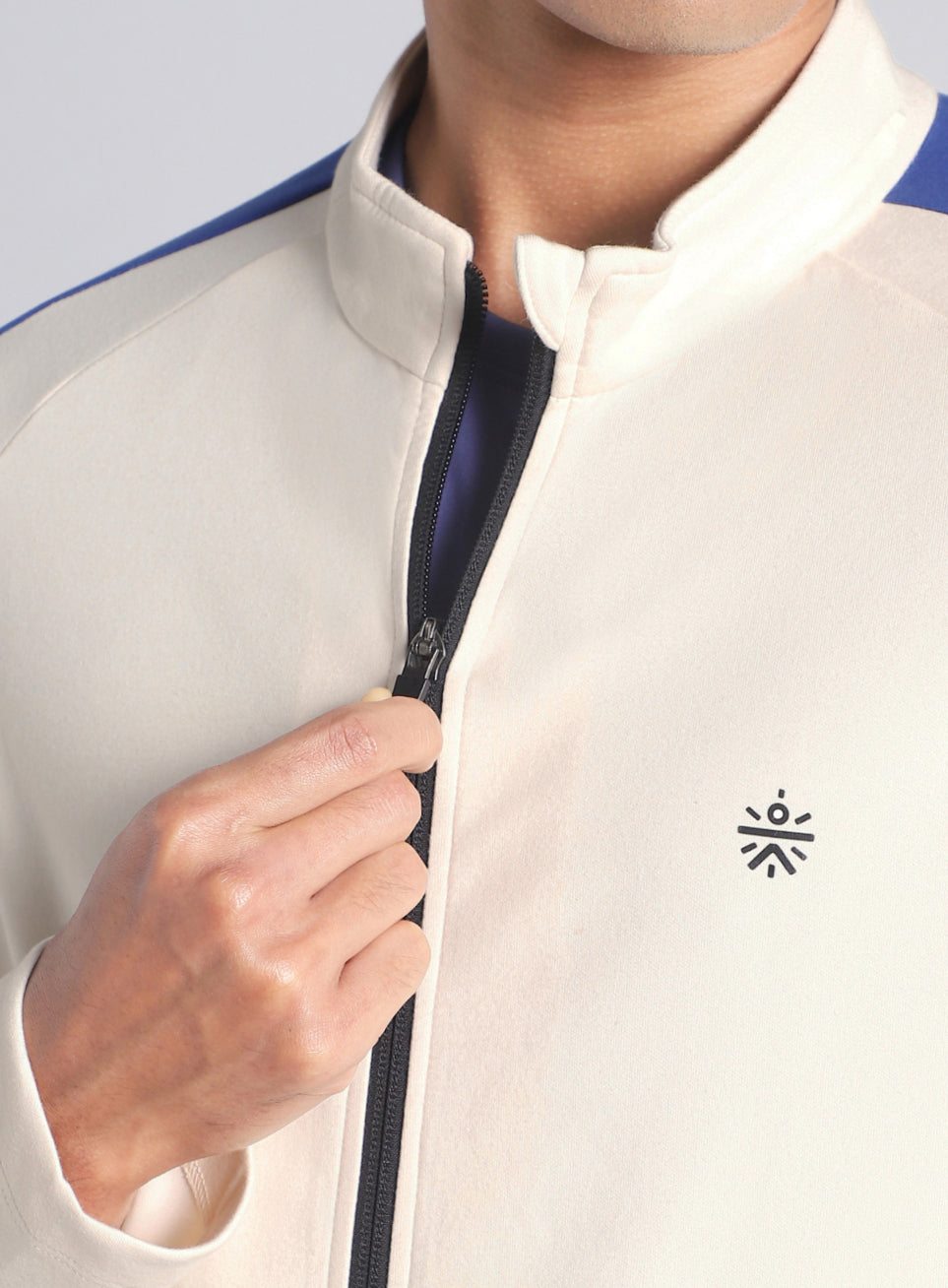 Level up your layers with the Men's Off White Workout Essential Mid Layer Jacket. Made from soft cotton-lycra for a smooth feel that stretches with you. The front-open zipper allows easy on-off, while the side pockets keep your essentials handy. The raglan sleeves support natural mobility, so you stay ready through every rep.