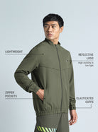 Stay sharp on the move with the Men's Olive Train in Workout Jacket, designed for comfort and function on every run. The FLY-DRY™ tech wicks away sweat fast to keep you moving fresh. Features a front open zipper for easy wear and elasticated cuffs for the lock in fit. The inner linning helps you to keep breathable while you are on the run. Finished with the reflective details that adds visibility during low light.