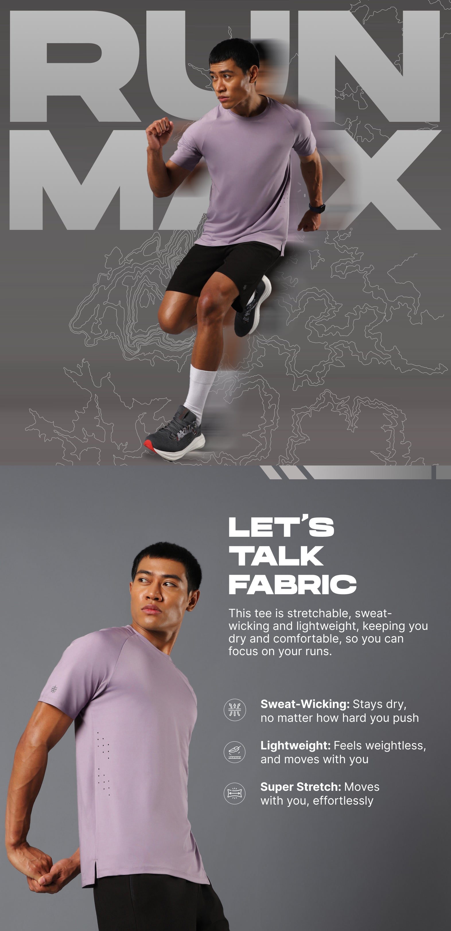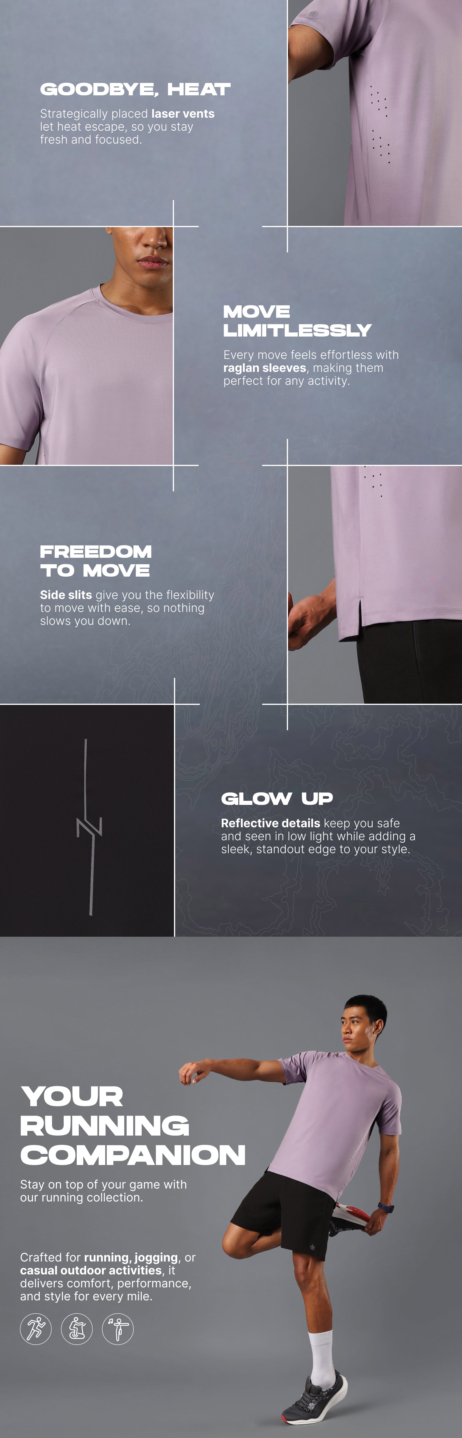Go faster, feel lighter in the Men's Purple Run Forward T-shirt. Made with FLY-DRY™ tech, this tee wicks away sweat to keep you dry, while the super stretch fabric moves with you effortlessly. The raglan sleeves enhance mobility, while the side slits add flexibility. These trackpants boast enhanced airflow with the laser vents keeping you cool through every mile.