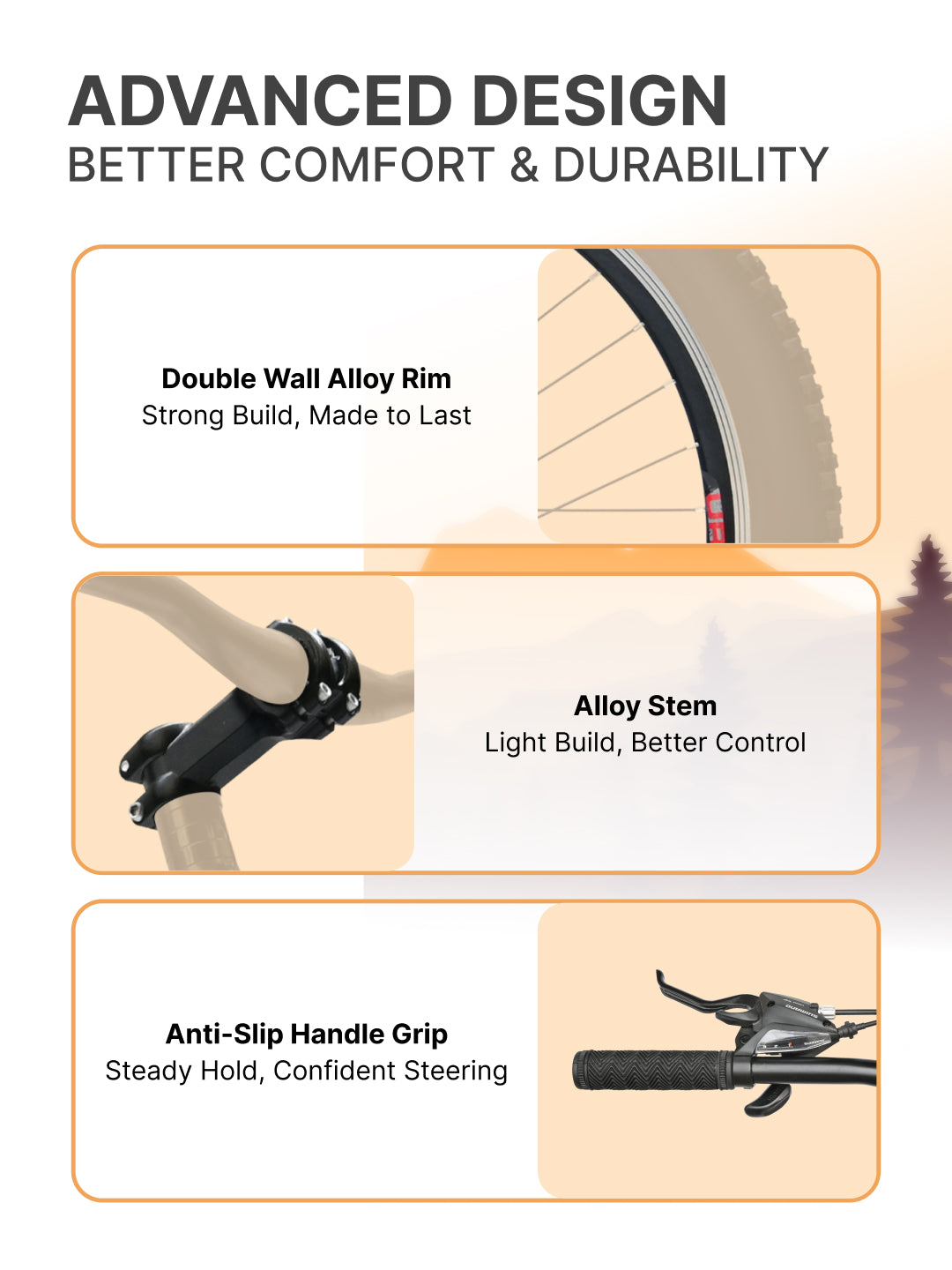 The shimano derailleurs and shifters are made with Japanese technology for a seamless gear shifting experience and trustworthy performance. The stylish bike has a 21 speed (7 X 3) setting that allows the rider to shift gears according to his requirement.|| The High-quality disc brakes on both front and rear wheels ensure stable and quick braking. The disc brakes help you navigate safely during challenging situations such as a crowded market.|| The bike comes packed with light and strong double walled alloy rims along with 27.5 inches wide tyres that supports comfortable riding and a major performance advantage on the road.|| Easily adjustable saddle height and an attractive grip offer superior comfort and well cushioned ride.|| Made from high quality steel frame these bikes are durably made to long last offering you excellent service life. Enjoy a quick ride to your work space, neighborhood rides, or trails on this Urban Terrain Bolt Ultra