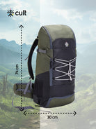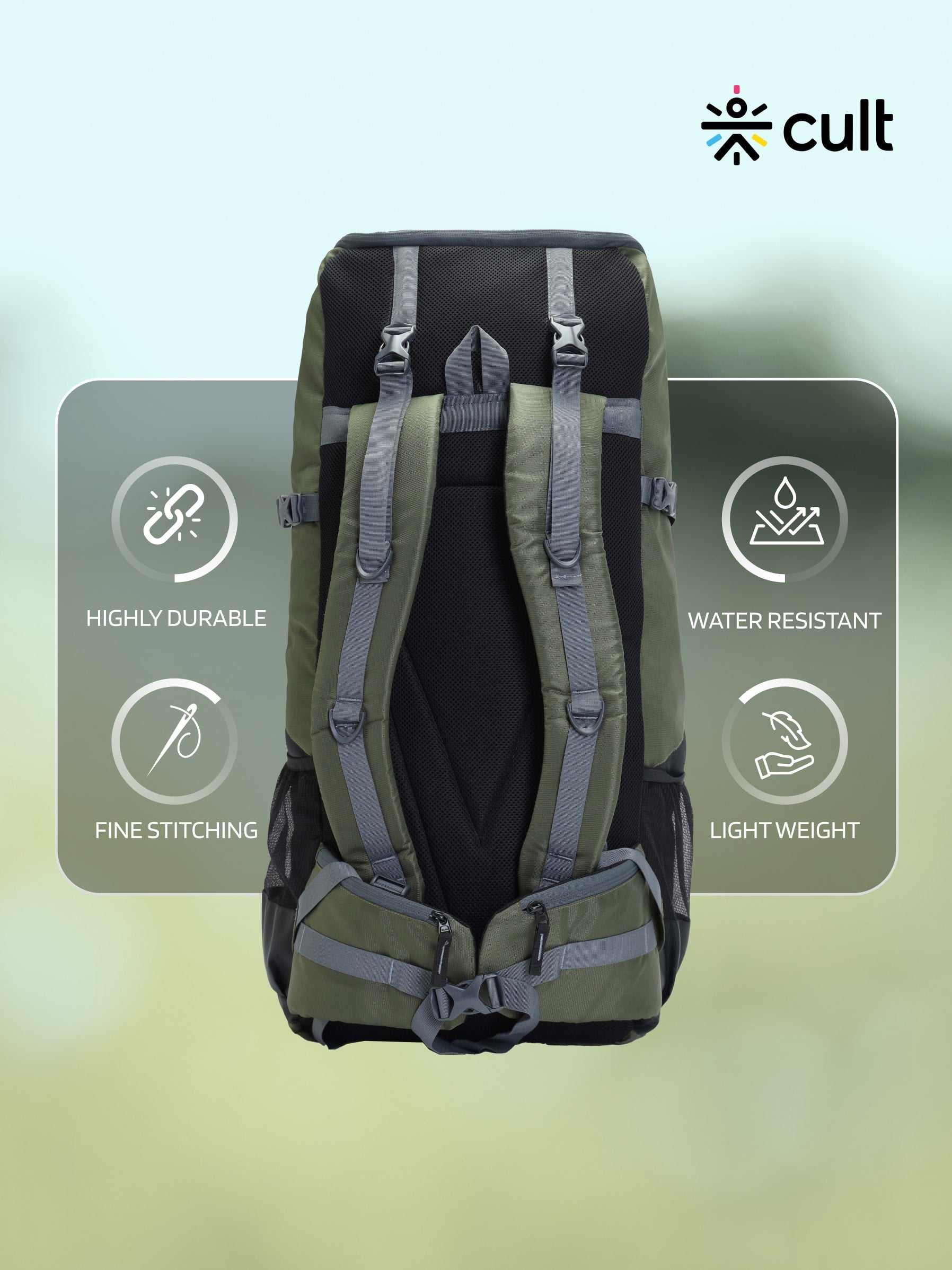 Cult 65 Litre Travel Backpack | Hiking Trekking Bag | Camping Rucksack with Water Proof Rain Cover, Shoe Compartment | Green | 1 Year Warranty