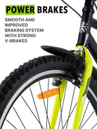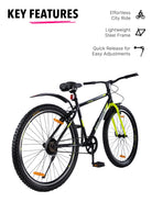 The High-quality V brakes on both front and rear wheels ensure stable and quick braking. The V brakes help you navigate safely during challenging situations such as a crowded market || The bike comes packed with light and strong Double walled alloy rims along with 27.5 inches wide tyres that supports comfortable riding and a major performance advantage on the road.|| Easily adjustable saddle height and an attractive grip offer superior comfort and well cushioned ride. The seat height can be adjusted without using any tools || Made from high quality steel frame these bikes are durably made to long last offering you excellent service life. Enjoy a quick ride to your work space, neighborhood rides, or trails on this Cultsport Vegas || Made of high quality material, sturdy, durable rubber tires with strong grip which can provide strong road support and durability to ensure stable and flexible cycling || The slight-rise handlebar enables upright riding to minimize back and shoulder strain. With a fierce, aggressive design, rigid suspension and front/rear handbrakes, the Stone Mountain is ready for epic outdoor fun || 1 Year Warranty On Frame and 6 months Domestic Warranty on Manufacturing Defects