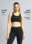 Stay supported and move freely with the Women's Black Energy Flow Printed Bra. Crafted with FLY-DRY™ tech, the fabric wicks away sweat to keep you dry and focused. The multi-stretch fabric offers flexibility that moves with you. The criss-cross back allows easy movement, while the adjustable back hook ensures a secure fit. The removable padding provides personalised coverage. The holographic logo and side print add a bold finish.