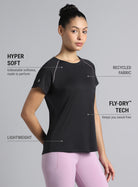 Bring effortless energy to every workout with the Women's Black HIIT Recycled Poly Performance T-shirt, designed for comfort that moves with you. Powered by FLY-DRY™ tech, it wicks away sweat to keep you cool and dry. Made with recycled fabric, it offers an eco-friendly choice with durable comfort. The hyper soft texture offers a soft and smooth feel on your skin. Lightweight in build, it gives you complete freedom to move, making it the go-to tee for performance and style.