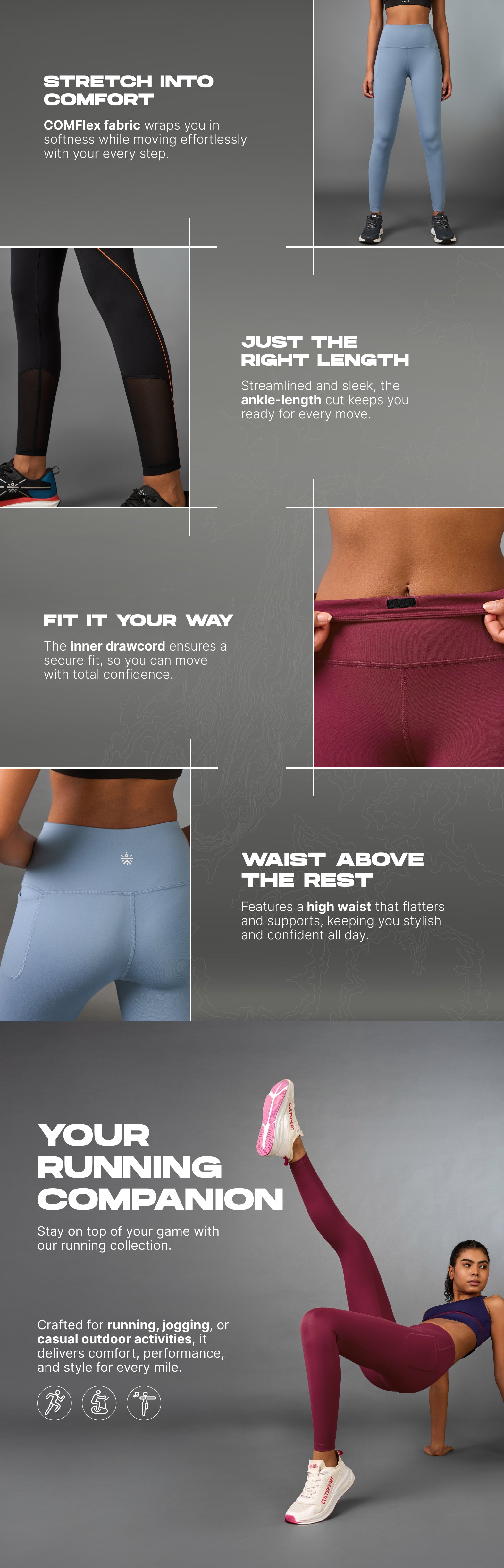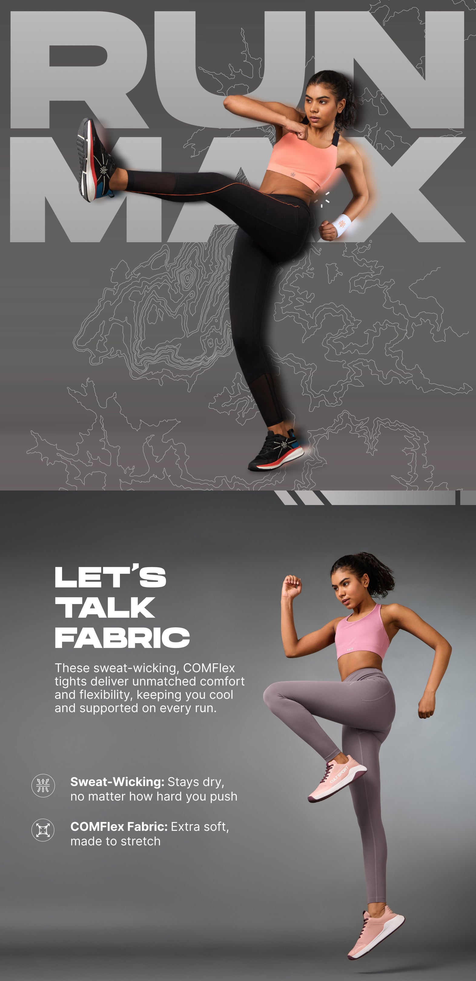 Women's Black Pace Up Running COMFlex Tights redefine what it means to move effortlessly. Crafted with COMFlex fabric, they deliver unbeatable softness and stretch for ultimate comfort. Featuring breathable mesh panels, super-stretch material for easy movement, and a hidden pocket to keep your essentials secure.