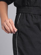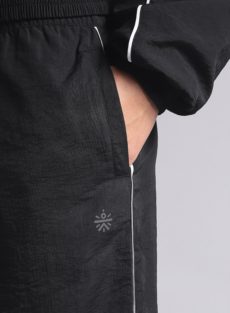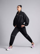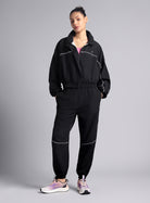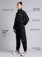 Run the streets in the Women's Black Sporty Outrun Track Suit, made to match your pace from warm-up to cool-down. The FLY-DRY™ fabric wicks away sweat to keep you dry and comfortable. The lightweight build lets you move freely through every stride. The elasticated waistband and cuffs deliver a secure fit, while side pockets keep essentials within reach.