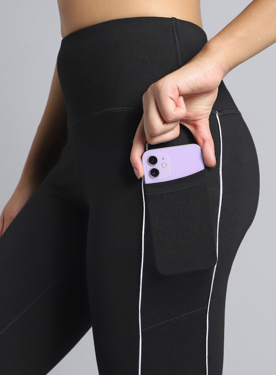 Power through every move in the Women's Black Train and Flow Cotton Tights, designed for comfort and performance. Made with soft cotton-lycr that offers gentle softness that flexes with you. The compression fit supports muscles for energised movement, while the anti-slip high waistband ensures a secure hold. The side pockets keep essentials close during every session.
